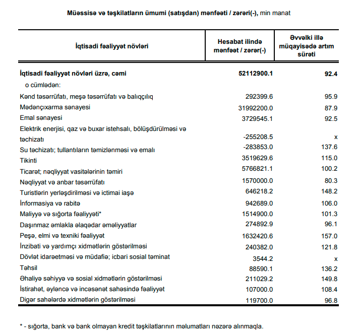 Azərbaycanın müəssisə və təşkilatlarının ötən dövrdəki fəaliyyəti nəticəsində ümumi mənfəət 5 milyard 211 milyon manat təşkil edib. Bu göstərici əvvəlki illə müqayisədə 7,6% azalma deməkdir.
