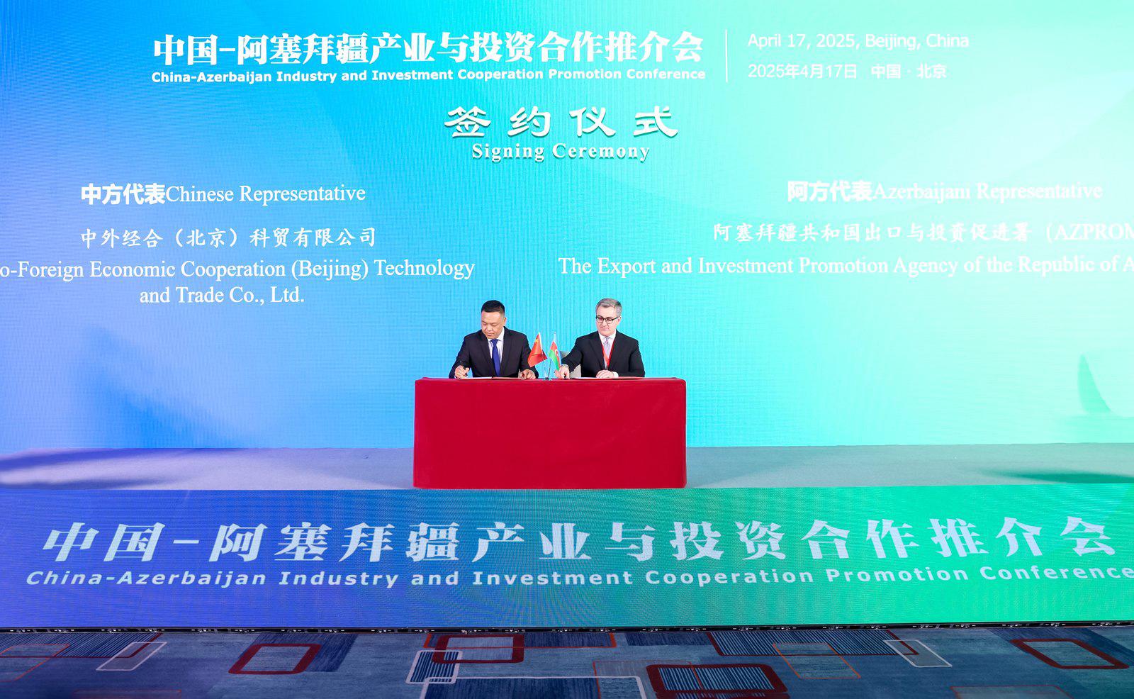Qeyd edək ki, iki ölkə arasında iqtisadi əlaqələrin inkişafı, o cümlədən investisiya əməkdaşlığı istiqamətində daha bir neçə sənəd aprel ayının 18-də Pekində İxracın və İnvestisiyaların Təşviqi Agentliyi, Azərbaycanın Çindəki ticarət nümayəndəsi Aparatı və Çinin Milli İnkişaf və İslahat Komissiyasının (NDRC) birgə təşkilatçılığı, Pekin şəhər İnkişaf və İslahat Komissiyasının dəstəyi ilə Çin-Azərbaycan Sənaye və İnvestisiya Əməkdaşlığının Təşviqi Konfransı çərçivəsində imzalanıb. İmzalanmış investisiya layihələrinin ümumi həcmi təxminən 335 milyon ABŞ dolları təşkil edir.