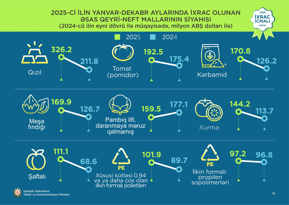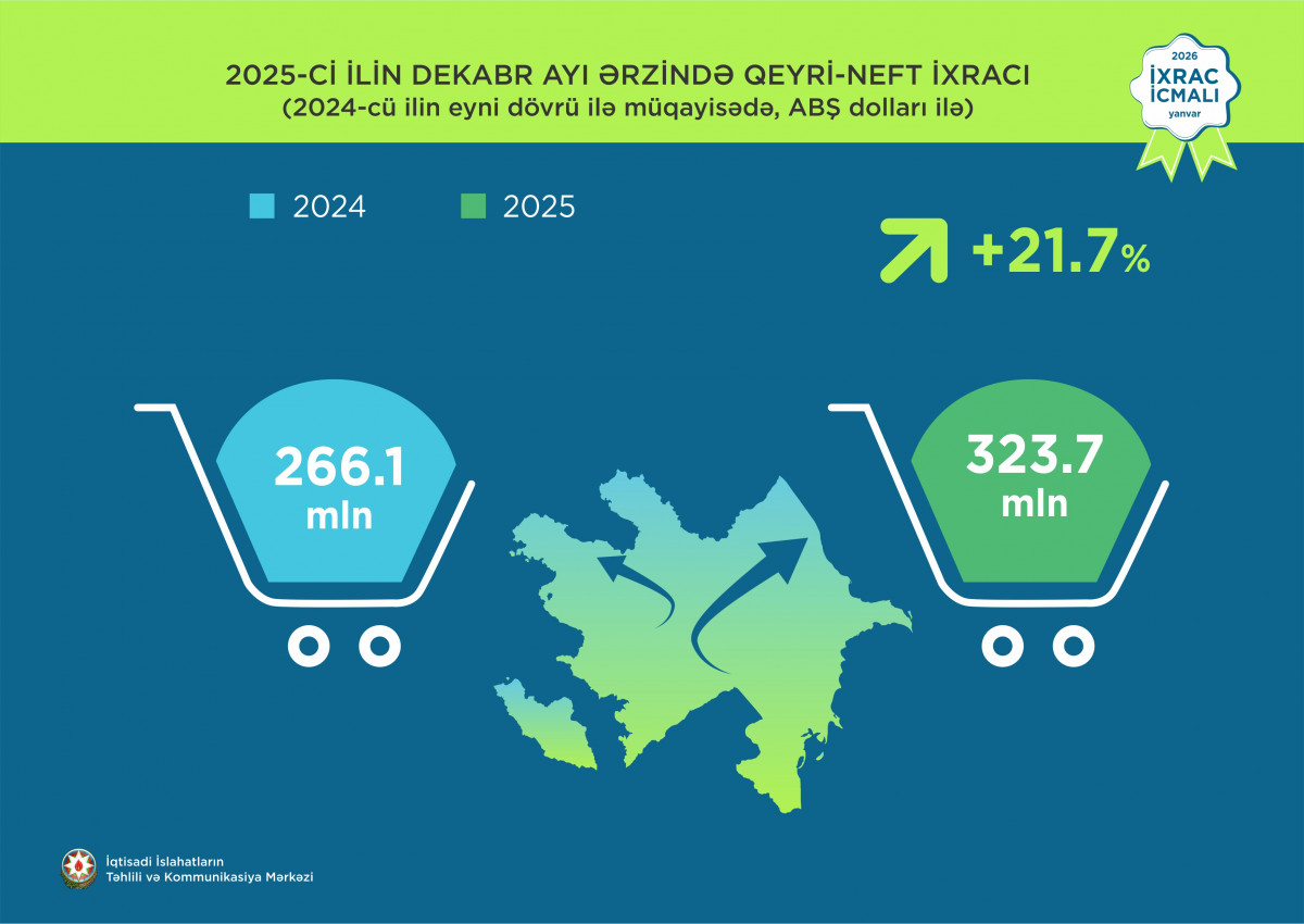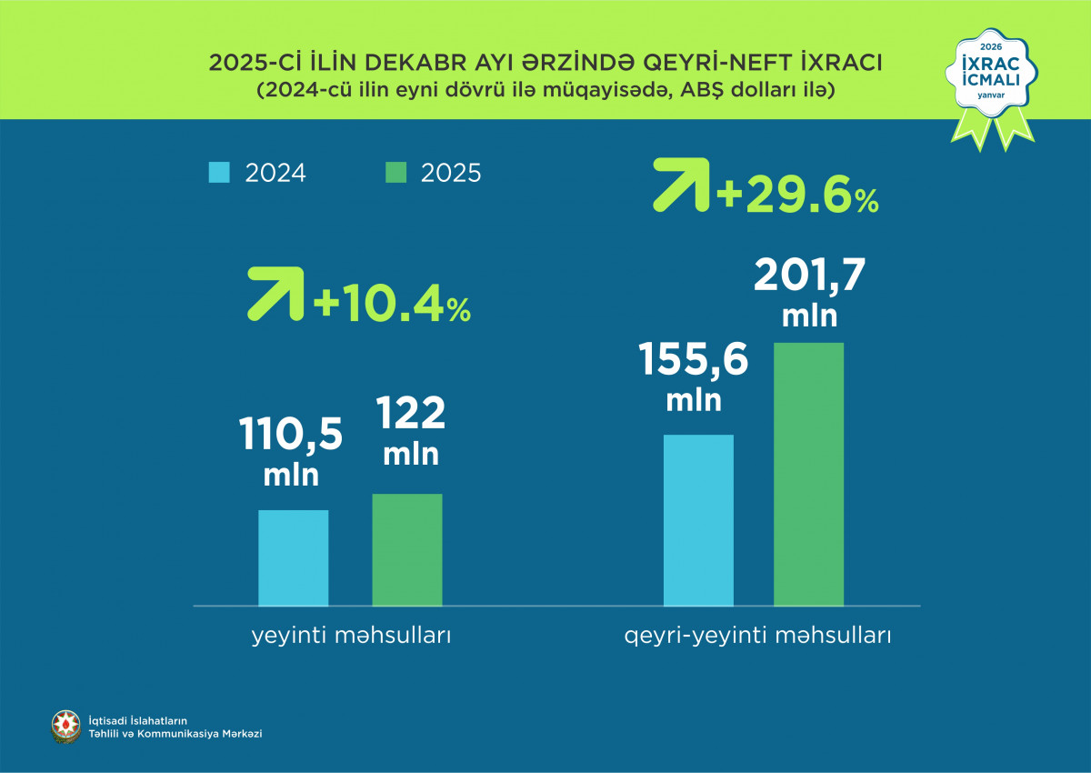 FED.az biznes və maliyyə xəbərləri portalı xəbər verir ki, icmala əsasən, 2025-ci ilin yanvar-dekabr aylarında Azərbaycanın qeyri-neft sektoru üzrə ixracı 2024-cü ilin müvafiq dövrü ilə müqayisədə 8,1% artaraq 3,6 milyard ABŞ dolları təşkil edib. Bu dövrdə yeyinti məhsulları üzrə ixrac 18,4% artaraq 1,2 milyard ABŞ dollarına bərabər olub.