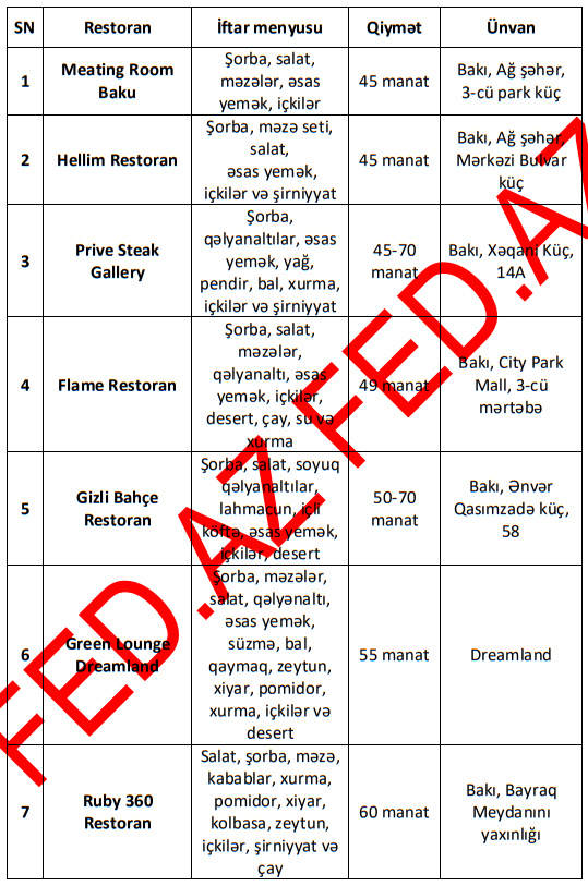 FED.az belə qiymətə iftar menyusu təklif edən restoranları təqdim edir: