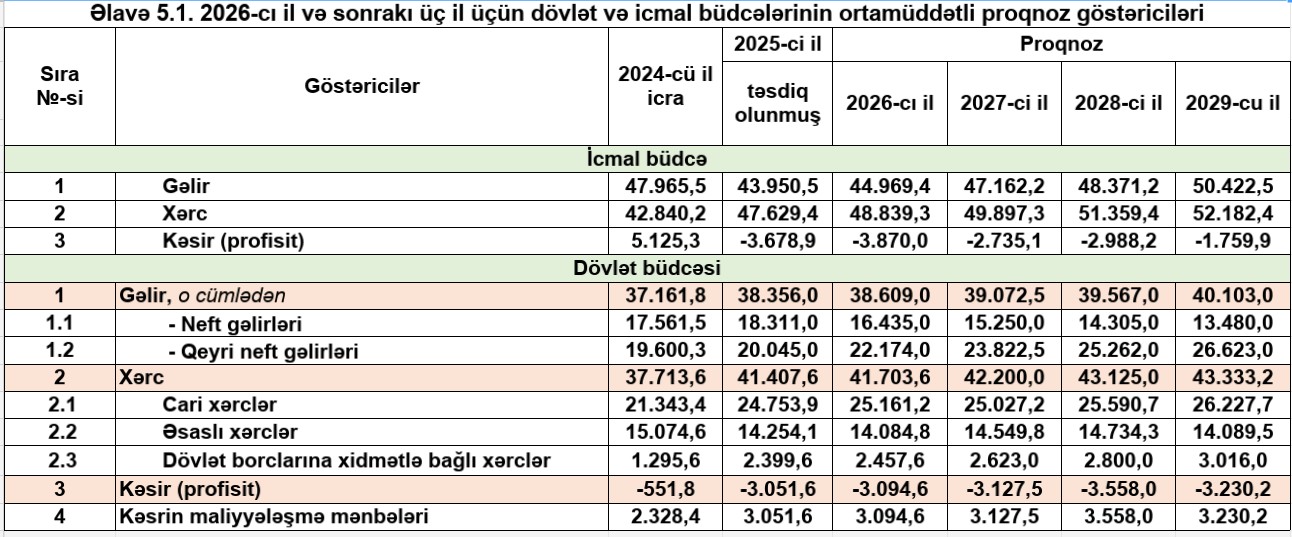 Proqnozlara əsasən, 2026-cı ildə dövlət büdcəsinin gəlirləri 44 milyard 969 milyon manat, xərcləri isə 48 milyard 839 milyon manat səviyyəsində gözlənilir. Büdcə kəsirinin təxminən 3 milyard 870 milyon manat olacağı ehtimal edilir.