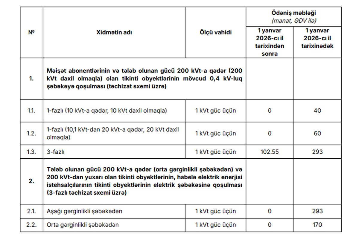Məişət abonentlərinin, həmçinin istehlak gücü 20 kVt-a qədər olan qeyri-yaşayış obyektlərinin mövcud 0,4 kV-luq elektrik şəbəkəsinə 1 fazlı sxem üzrə qoşulması ödənişsiz olacaq.