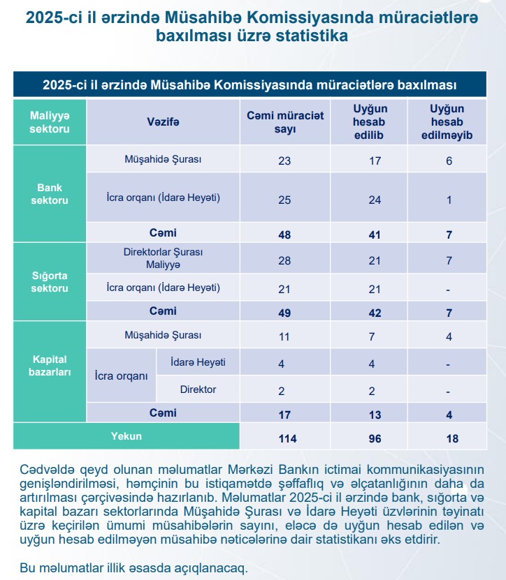 FED.az biznes və maliyyə xəbərləri portalı xəbər verir ki, statistikada qeyd olunan məlumatlar 2025-ci il ərzində bank, sığorta və kapital bazarı sektorlarında Müşahidə Şurası və İdarə Heyəti üzvlərinin təyinatı üzrə keçirilən ümumi müsahibələrin sayını, eləcə də uyğun hesab edilən və uyğun hesab edilməyən müsahibə nəticələrinə dair statistikanı əks etdirir. Bu məlumatların illik əsasda açıqlanması nəzərdə tutulub.