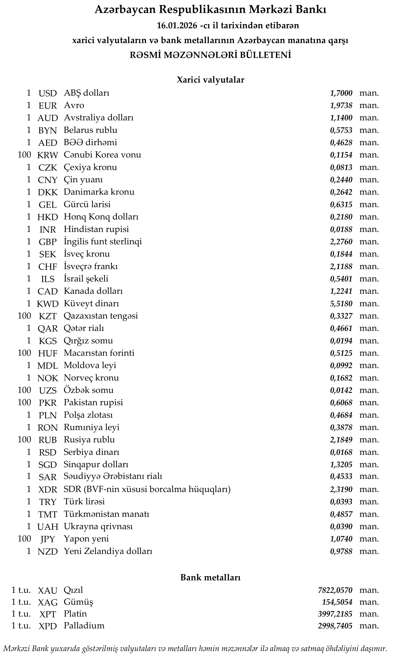 FED.az xəbər verir ki, yanvarın 16-da ABŞ dollarının məzənnəsi dəyişməyərək 1,7000 manat təşkil edib. Türkiyə lirəsi 0,0393 manata kimi, Avro 1,9738 manatadək ucuzlaşıb, Rusiyanın 100 rublu isə 2,1849 manata kimi bahalaşıb.