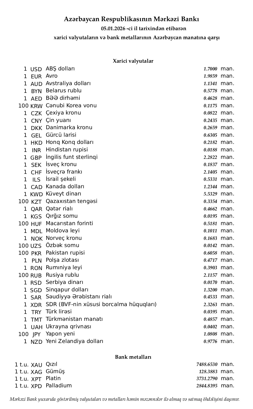 FED.az xəbər verir ki, yanvarın 5-də ABŞ dollarının məzənnəsi dəyişməyərək 1,7000 manat təşkil edib. Türkiyə lirəsi 0,0395 manatadək, Avro 1,9859 manata kimi, Rusiyanın 100 rublu isə 2,1157 manata kimi ucuzlaşıb.