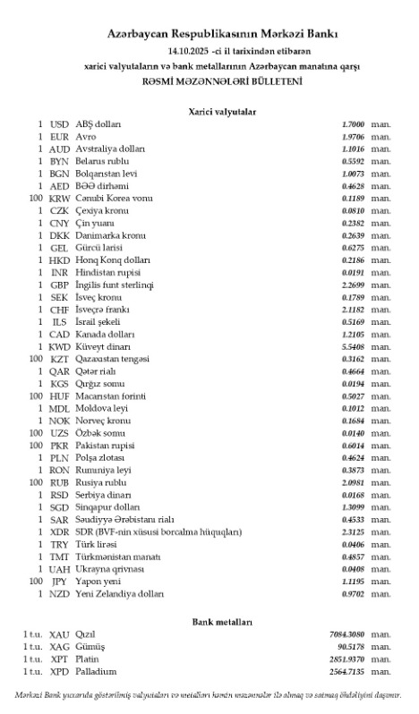 FED.az xəbər verir ki, oktyabrın 14-də ABŞ dollarının məzənnəsi dəyişməyərək 1,7000 manat təşkil edib. Türkiyə lirəsi 0,0406 manata kimi, Rusiyanın 100 rublu 2,0981 manatadək bahalaşıb, avro isə 1.9706 manata kimi ucuzlaşıb.