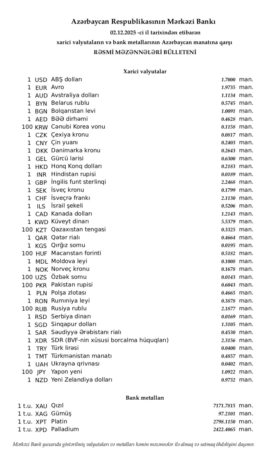 Azərbaycan Mərkəzi Bankının bu günə olan rəsmi valyuta məzənnələrinə əsasən, ABŞ dollarının məzənnəsi dəyişməyərək 1,7000 manat olub.