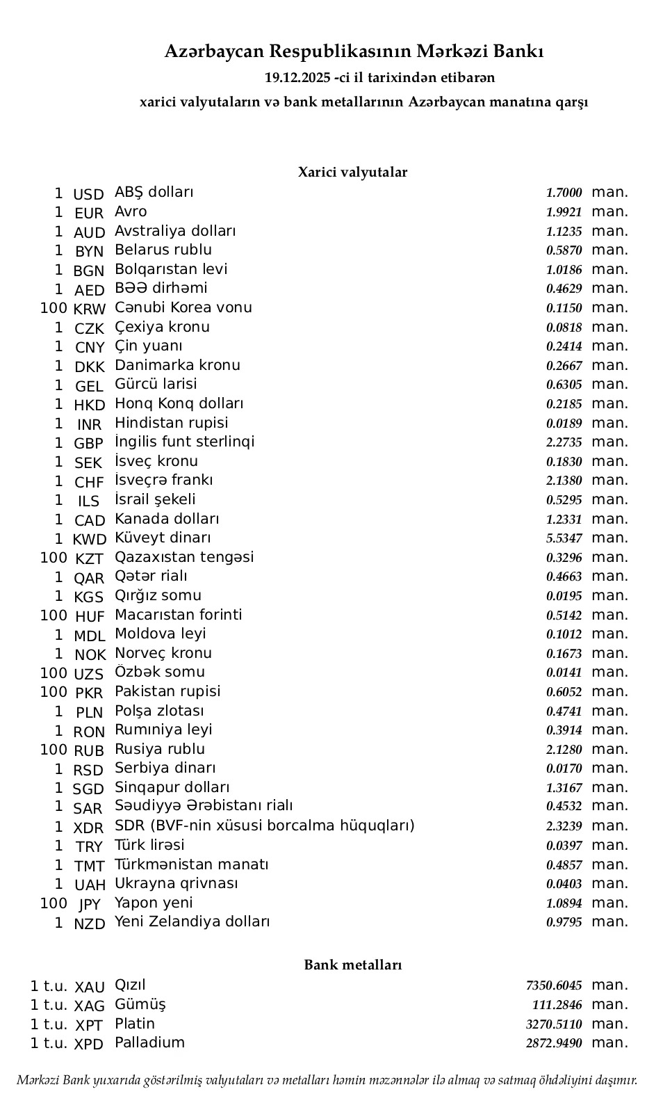 Azərbaycan Mərkəzi Bankının bu günə olan rəsmi valyuta məzənnələrinə əsasən, ABŞ dollarının məzənnəsi dəyişməyərək 1,7000 manat olub.