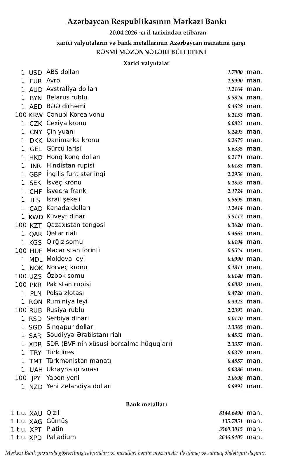 Azərbaycan Mərkəzi Bankının bu günə olan rəsmi valyuta məzənnələrinə əsasən, ABŞ dollarının məzənnəsi dəyişməyərək 1,7000 manat olub.