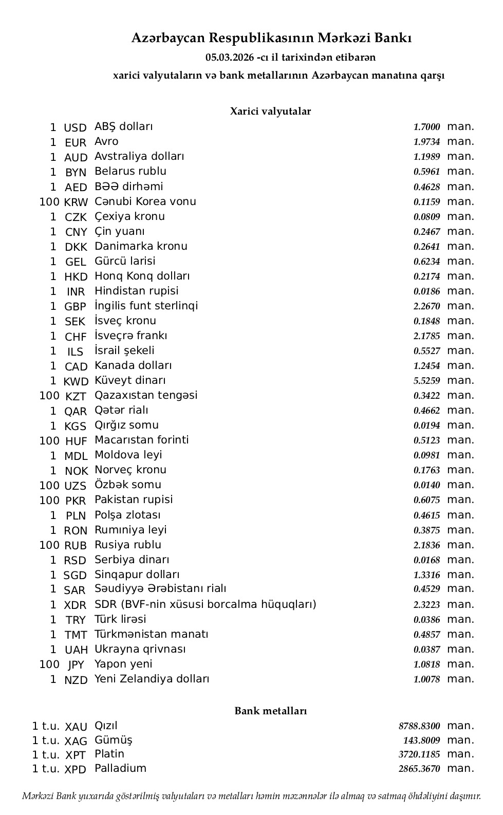 FED.az biznes və maliyyə xəbərləri portalı xəbər verir ki, martın 4-də ABŞ dollarının məzənnəsi dəyişməyərək 1,7000 manat, Türkiyə lirəsi isə 0,0386 manat təşkil edib. Öz növbəsində, Rusiyanın 100 rublu 2.1836 manata kimi ucuzlaşıb, Avro isə 1.9734 manatadək bahalaşıb.