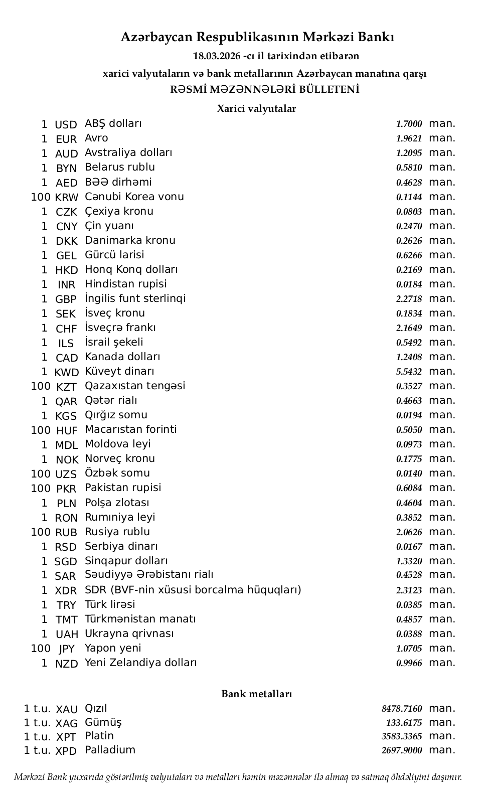 Azərbaycan Mərkəzi Bankının bu günə olan rəsmi valyuta məzənnələrinə əsasən, ABŞ dollarının məzənnəsi dəyişməyərək 1,7000 manat olub.