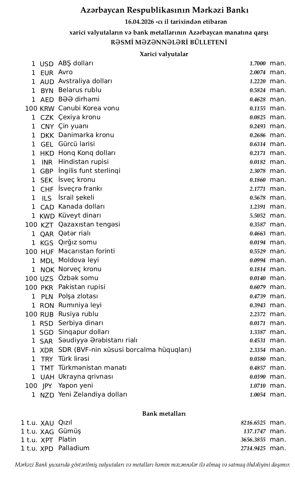 FED.az biznes və maliyyə xəbərləri portalı xəbər verir ki, aprelin 16-da ABŞ dollarının məzənnəsi dəyişməyərək 1,7000 manat, Türkiyə lirəsi 0,0380 manat təşkil edib. Avro 2.0074 manatadək bahalaşıb, Rusiyanın 100 rublu isə 2.2372 manatadək ucuzlaşıb.