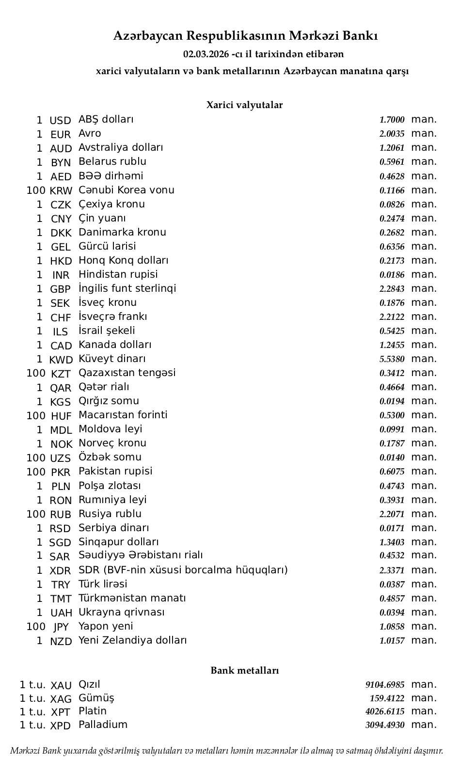 Azərbaycan Mərkəzi Bankının bu günə olan rəsmi valyuta məzənnələrinə əsasən, ABŞ dollarının məzənnəsi dəyişməyərək 1,7000 manat olub.