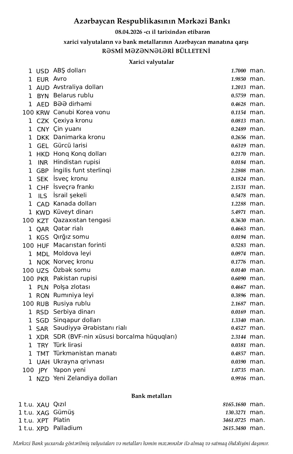 Azərbaycan Mərkəzi Bankı bu günün valyuta məzənnələrini açıqlayıb.