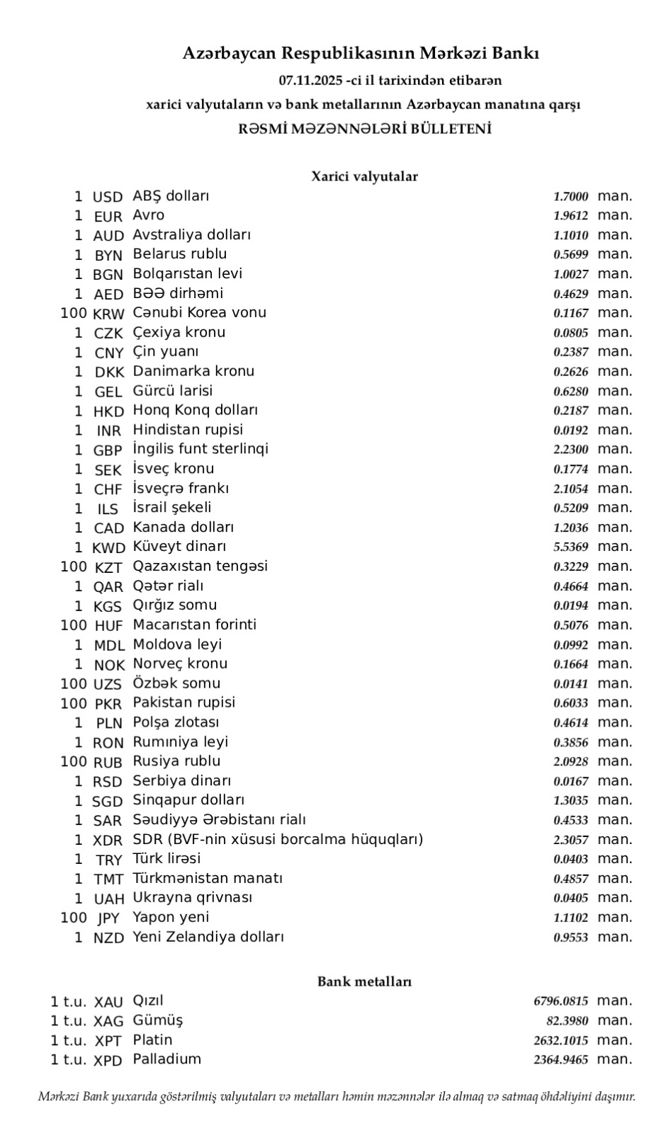 Azərbaycan Mərkəzi Bankının bu günə olan rəsmi valyuta məzənnələrinə əsasən, ABŞ dollarının məzənnəsi dəyişməyərək 1,7000 manat olub.