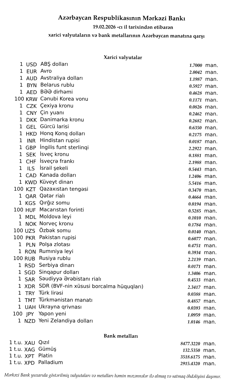 Azərbaycan Mərkəzi Bankının bu günə olan rəsmi valyuta məzənnələrinə əsasən, ABŞ dollarının məzənnəsi dəyişməyərək 1,7000 manat olub.