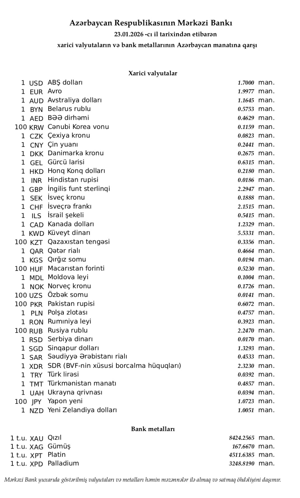 Azərbaycan Mərkəzi Bankının bu günə olan rəsmi valyuta məzənnələrinə əsasən, ABŞ dollarının məzənnəsi dəyişməyərək 1,7000 manat olub.