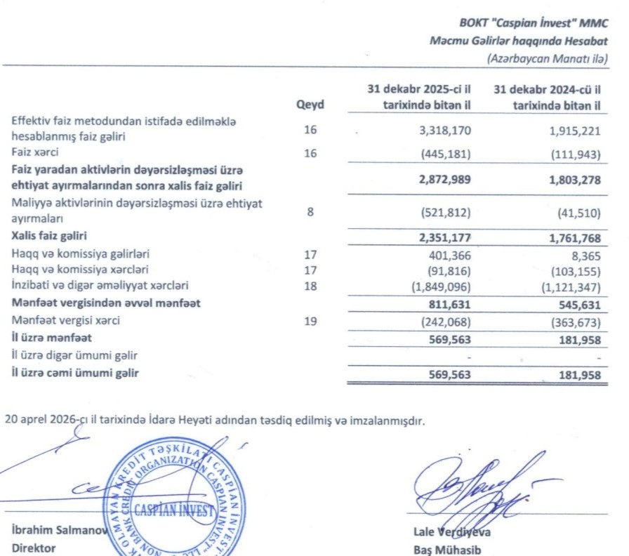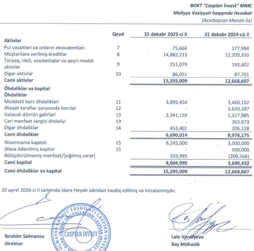 “Caspian İnvest” bank olmayan kredit təşkilatı (BOKT) Məhdud Məsuliyyətli Cəmiyyəti 2025-ci il üzrə maliyyə vəziyyətini açıqlayıb.