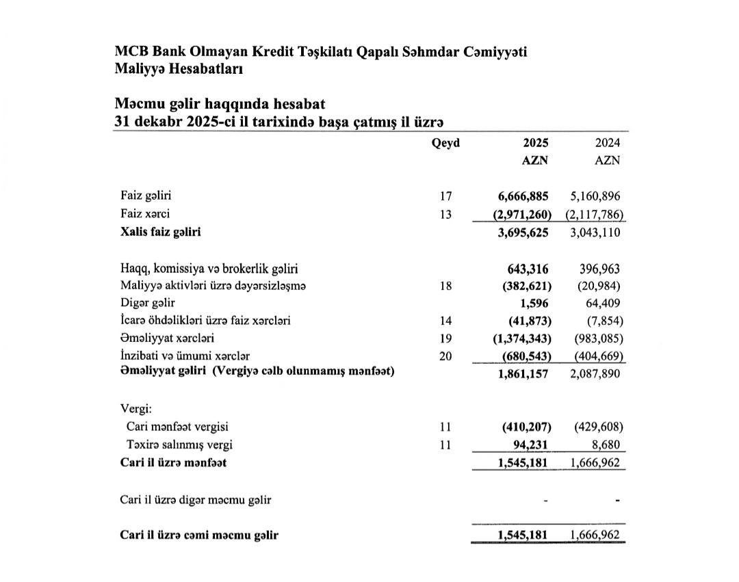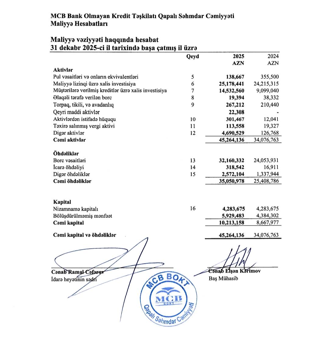 “MCB” bank olmayan kredit təşkilatı (BOKT) Məhdud Məsuliyyətli Cəmiyyəti 2025-ci il üzrə maliyyə vəziyyətini açıqlayıb.