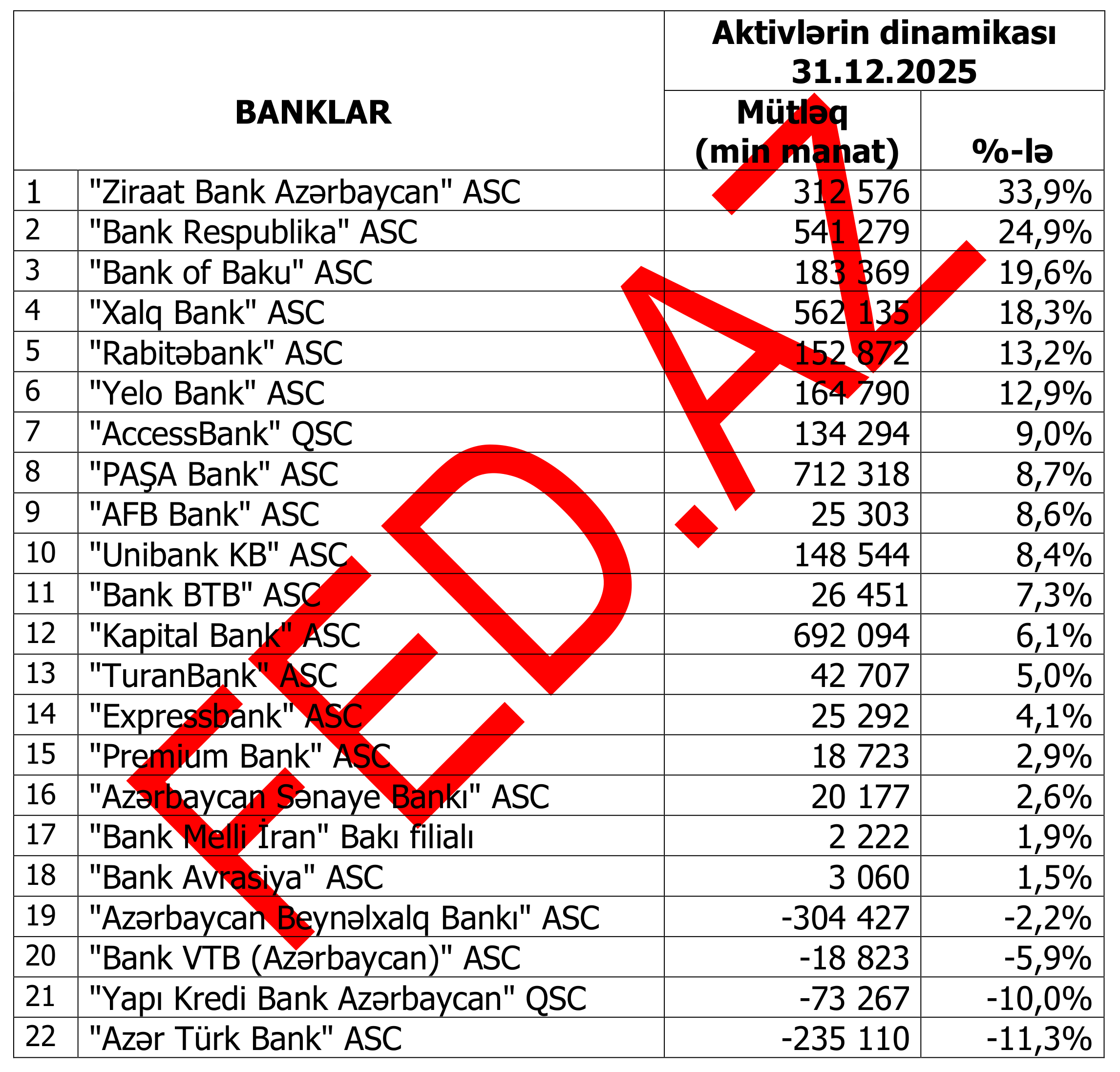 Azərbaycanda aktivlərin dinamikası üzrə – BANKLARIN RENKİNQİ (31.12.2025)