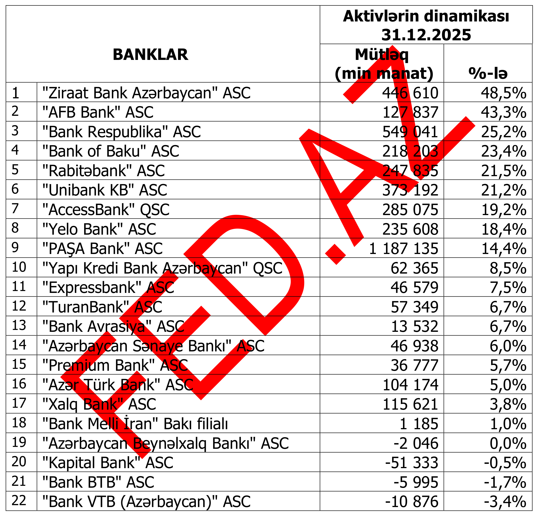 Azərbaycanda aktivlərin həcmi üzrə – BANKLARIN RENKİNQİ (31.12.2025)