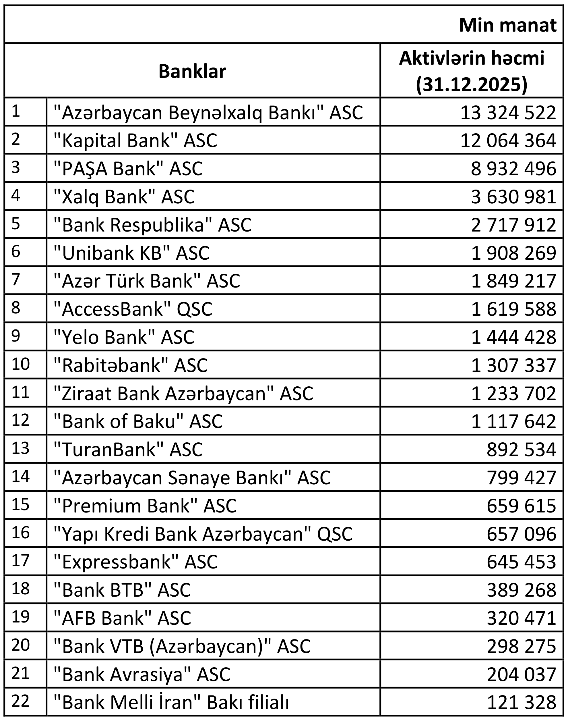 Azərbaycanda aktivlərin həcmi üzrə – BANKLARIN RENKİNQİ (31.12.2025)