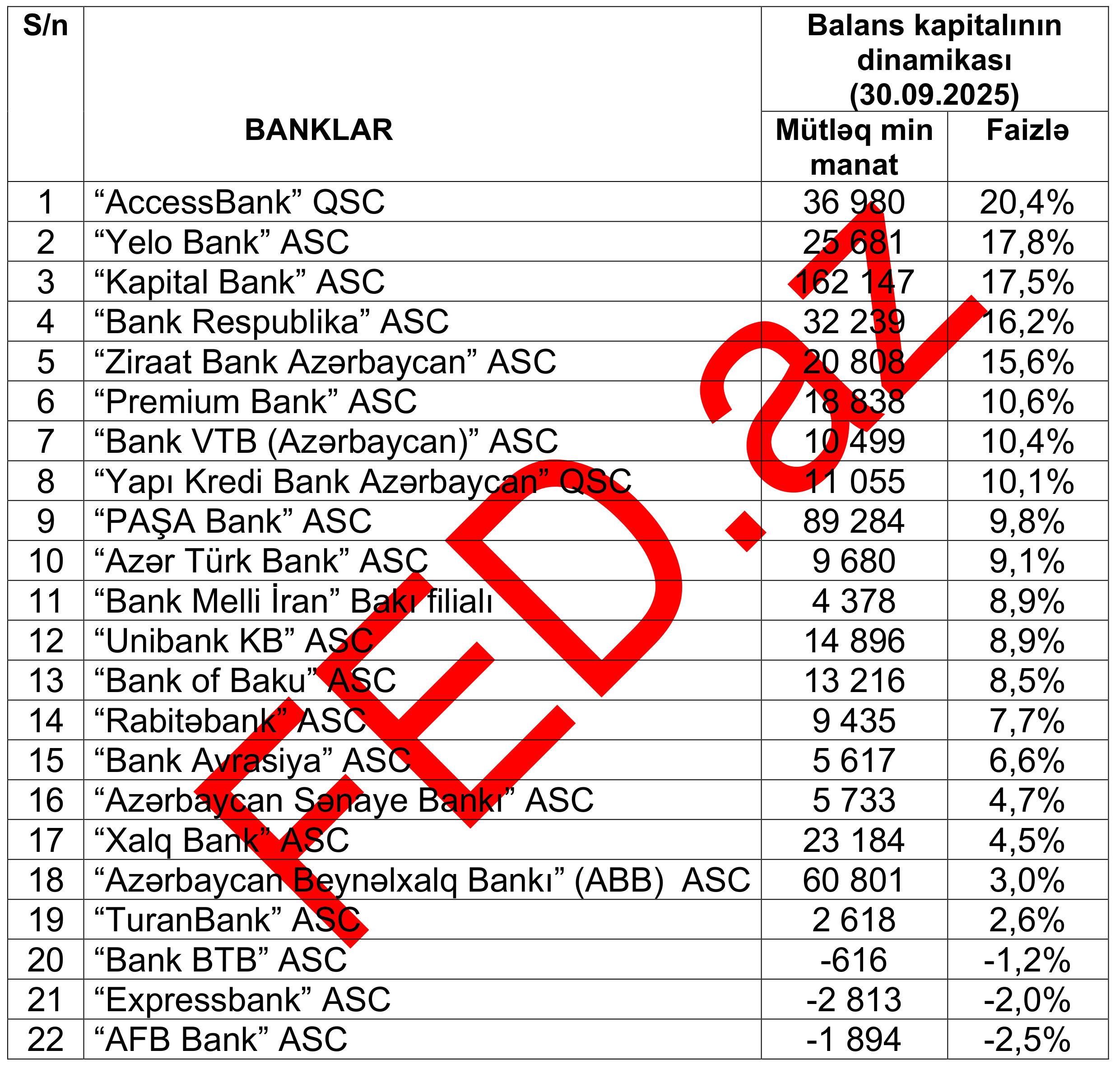 Azərbaycanda balans kapitalının dinamikası üzrə – BANKLARIN RENKİNQİ (30.09.2025)