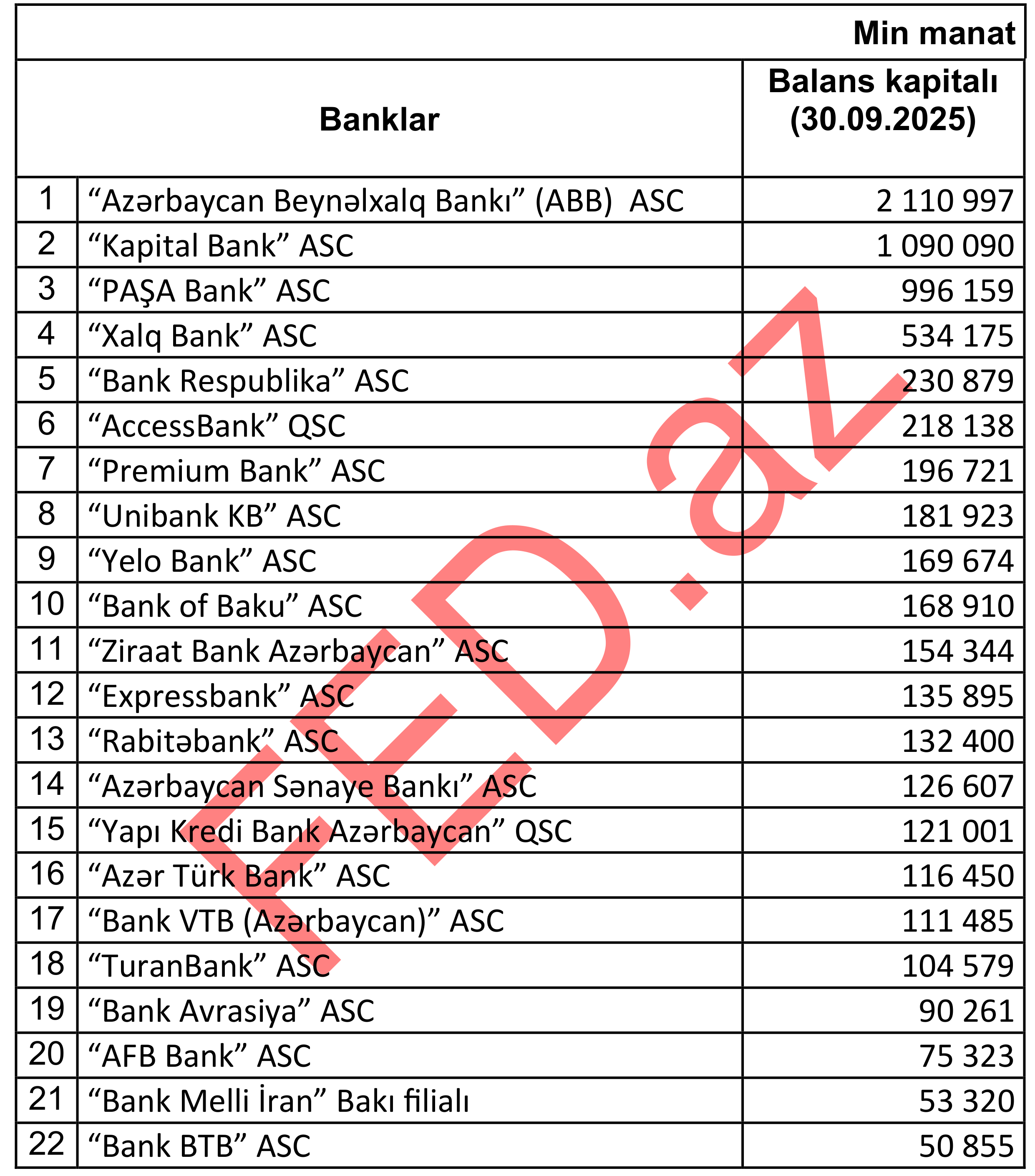 Azərbaycanda balans kapitalının həcmi üzrə – BANKLARIN RENKİNQİ (30.09.2025)