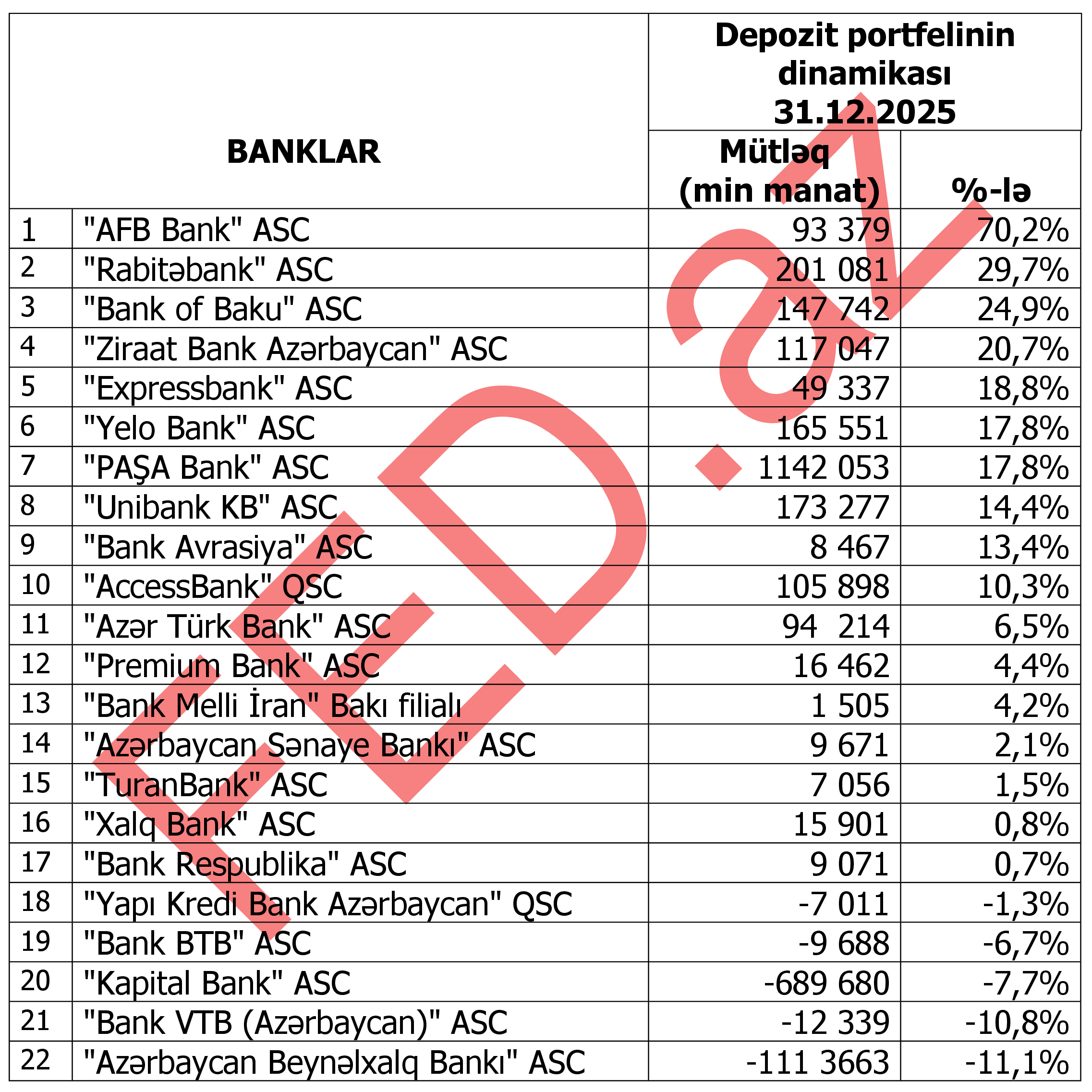 Azərbaycanda depozit portfelinin dinamikası üzrə – BANKLARIN RENKİNQİ (31.12.2025)