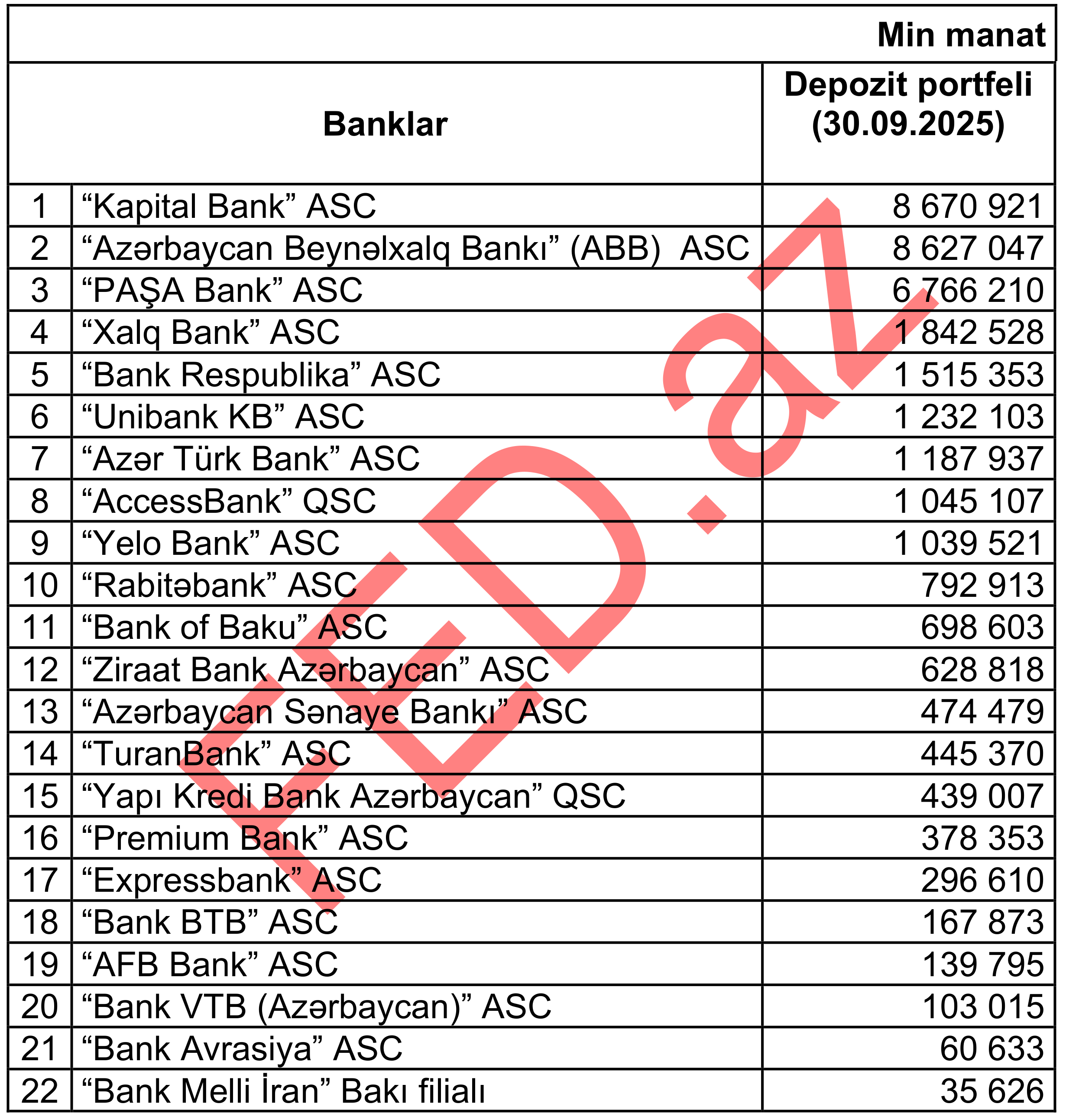 Azərbaycanda depozit portfelinin həcmi üzrə – BANKLARIN RENKİNQİ (30.09.2025)