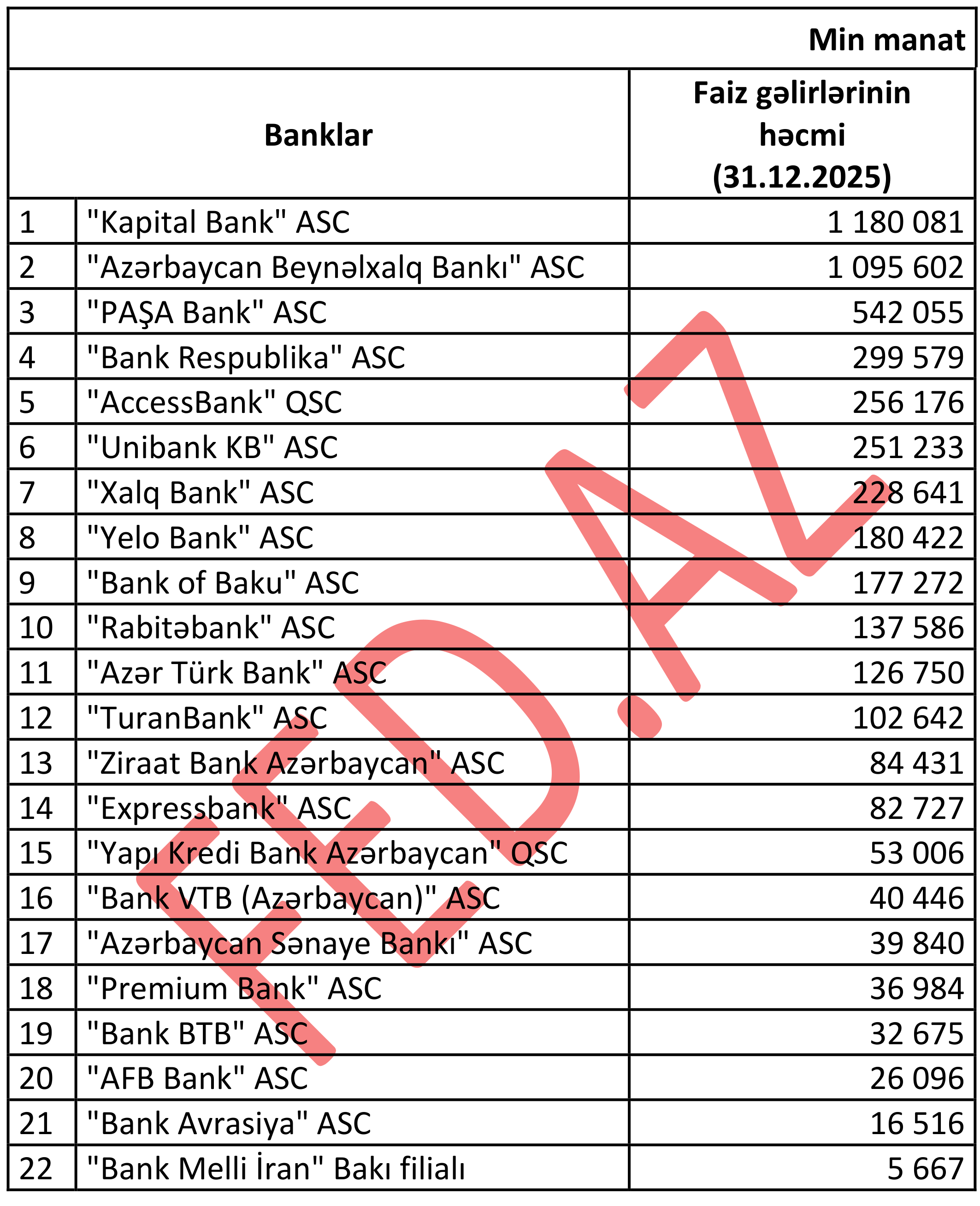 FED.az biznes və maliyyə xəbərləri portalı Azərbaycanda fəaliyyət göstərən bankların faiz gəlirlərinin həcminə görə renkinqini təqdim edir.