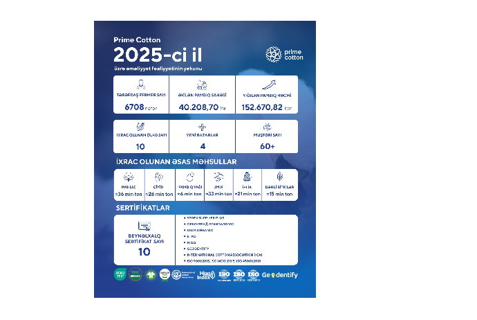 Qlobal pambıq və iplik bazarında davamlılıq, sertifikatlaşdırma və mənşə izlənəbilənliyinə artan tələbat fonunda Prime Cotton-un 2025-ci il nəticələri Azərbaycanın qeyri-neft ixrac potensialının güclənməsinə mühüm töhfə kimi qiymətləndirilir.