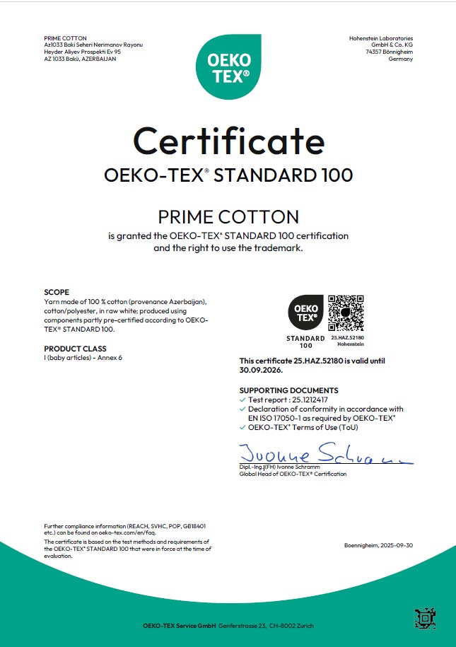 Azərbaycanın pambıq və tekstil sənayesinin aparıcı şirkətlərindən biri olan Prime Cotton, beynəlxalq keyfiyyət və məsuliyyət standartlarına uyğunluğunu bir daha təsdiqlədi. Şirkət məhsullarının OEKO-TEX® Standard 100 – Product Class I (Baby Articles) sertifikatı ilə təsdiqləndiyini elan edib.