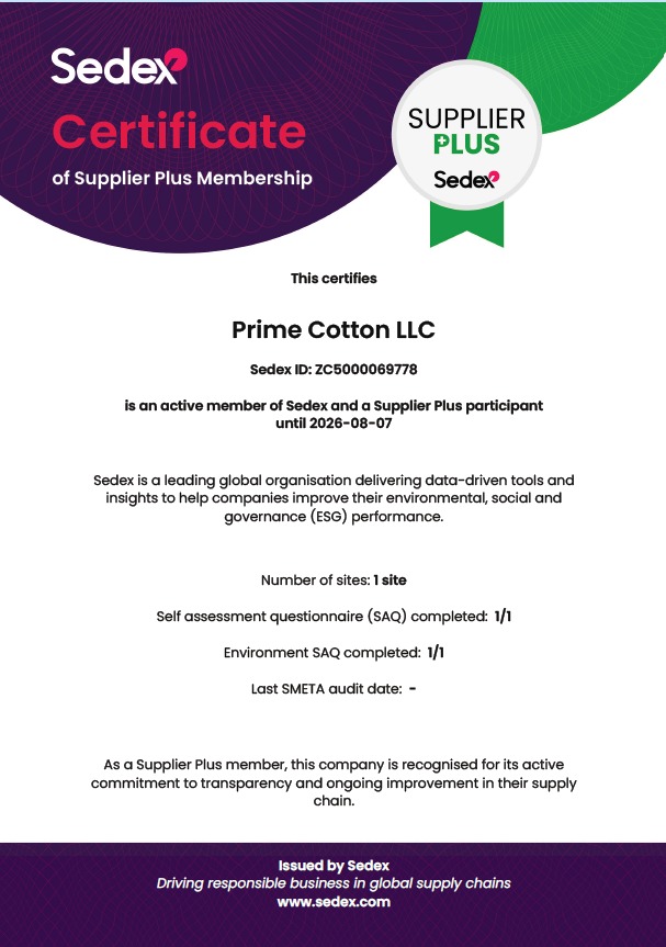 Prime Cotton-un beynəlxalq təşkilatlardan əldə etdiyi uğurlar bununla bitmir. Şirkət artıq Sedex- in Supplier Plus üzvü kimi qlobal təchizat zəncirində sosial, etik və ekoloji məsuliyyət