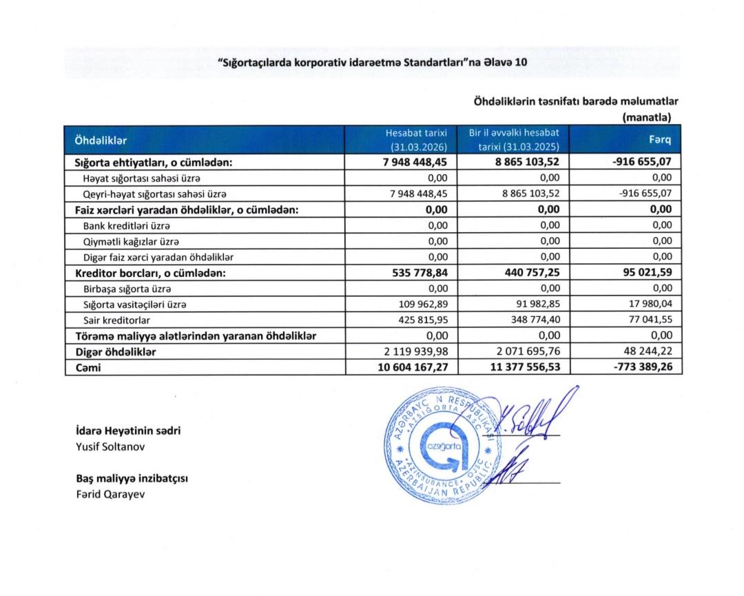 Bu dövrdə şirkətin öhdəliklərinin həcmi 10 milyon 604 min manat olub. Bu da, ötən ilin sonu ilə müqayisədə126 min manat (1,2%) azalma deməkdir.