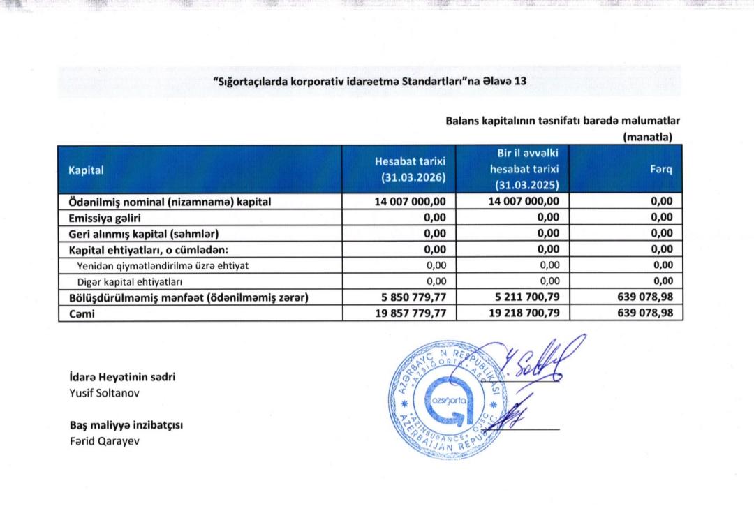 2026-cı ilin mart ayının sonunda şirkətin cəmi kapitalı 19 milyon 858 min manat təşkil edib. Bu, 2025-ci ilin sonuna nəzərən 225 min manat (1,1%) çoxdur.