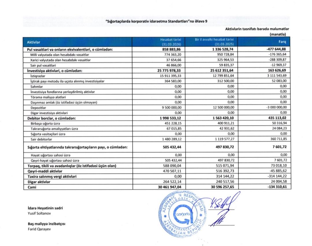 Cari ilin birinci rübünün sonuna “AzSığorta” ASC-nin aktivlərinin həcmi 30 milyon 462 min manat təşkil edib. Bu, 2025-ci ilin sonu ilə müqayisədə 99 min manat (0,3%) artım deməkdir.