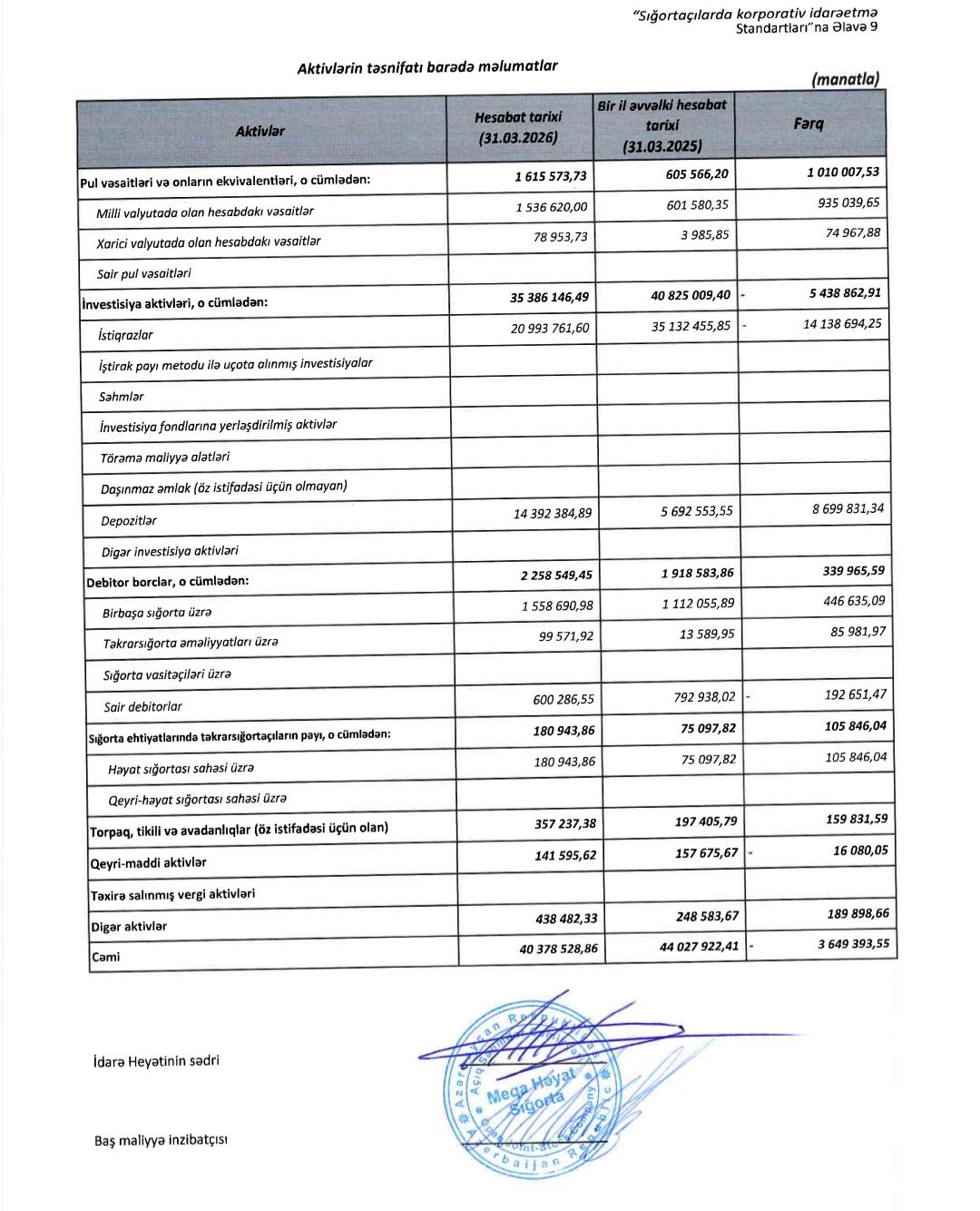 Bu ilin mart ayının sonunda şirkətin cəmi aktivlərinin həcmi 40 milyon 379 min manat olub. Bu, ötən ilin sonu ilə müqayisədə 4 milyon 509 min manat (12,6%) çoxdur.