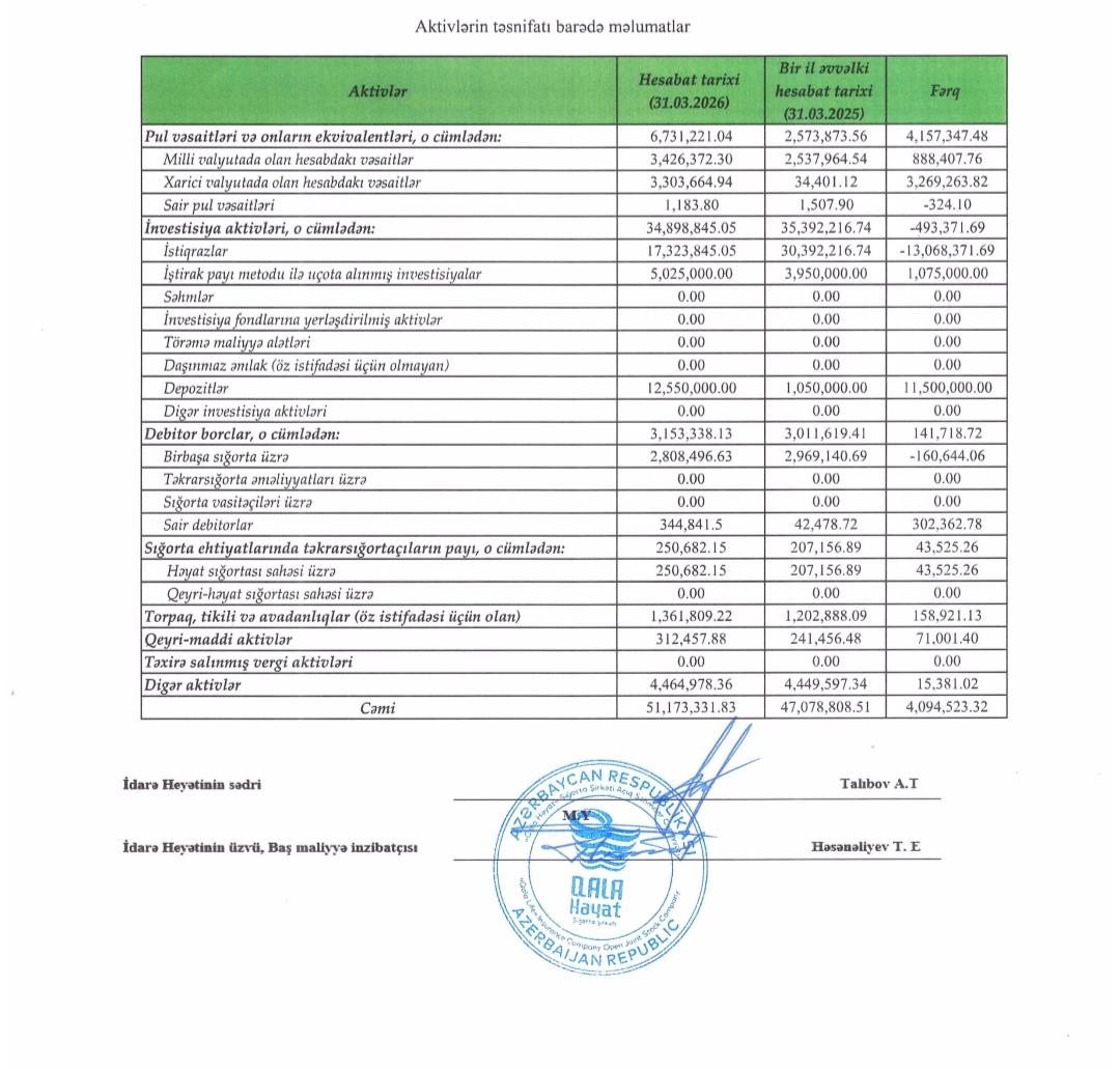 Hesabat dövrünün sonuna “Qala Həyat Sığorta”nın aktivlərinin həcmi 51 milyon 173 min manat olub. Bu, 2025-ci ilin sonu ilə müqayisədə 4 milyon 869 min manat (8,7%) azdır.