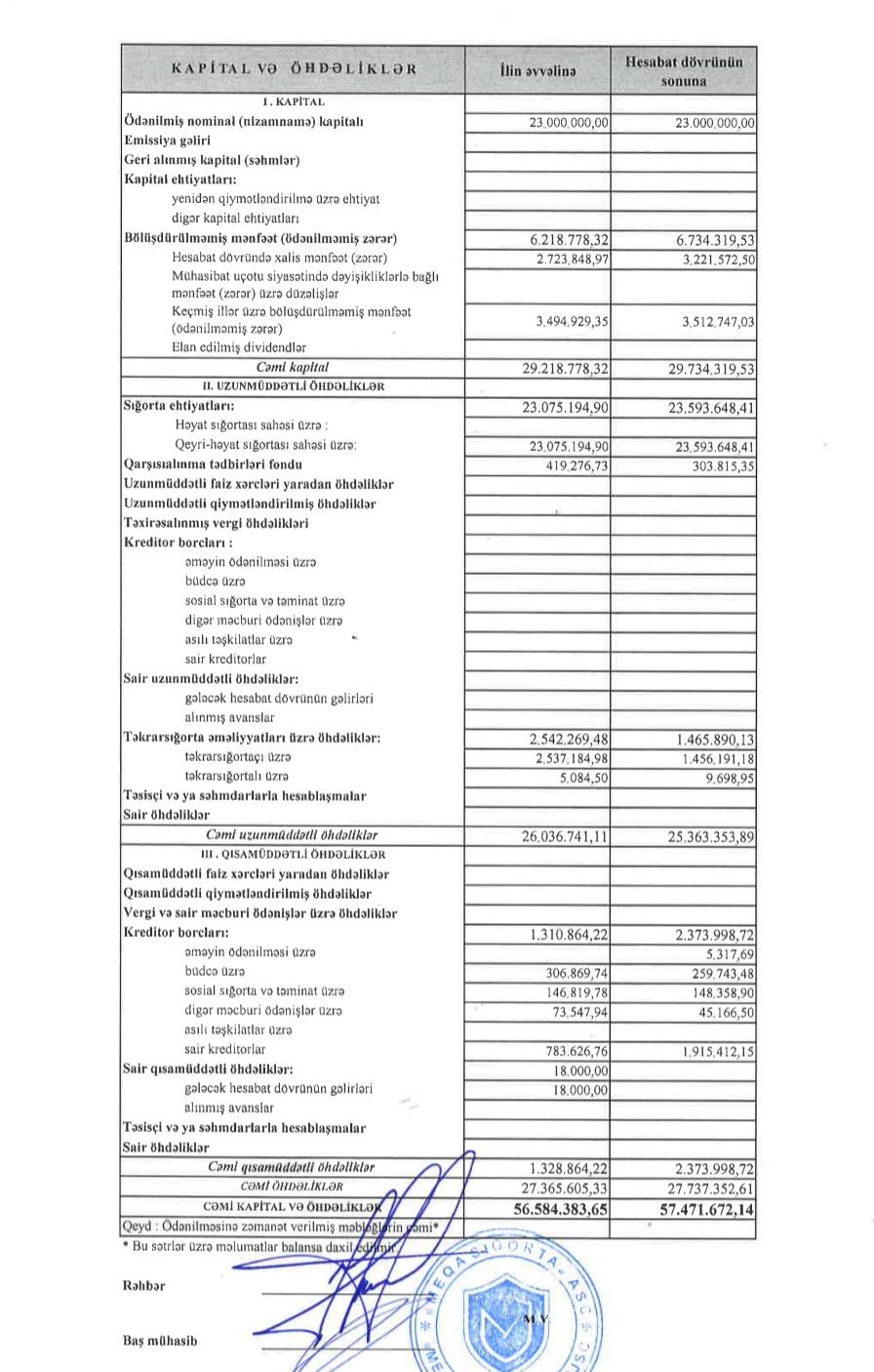 Bu dövrdə şirkətin kapitalı 29 milyon 219 min manat təşkil edib.
