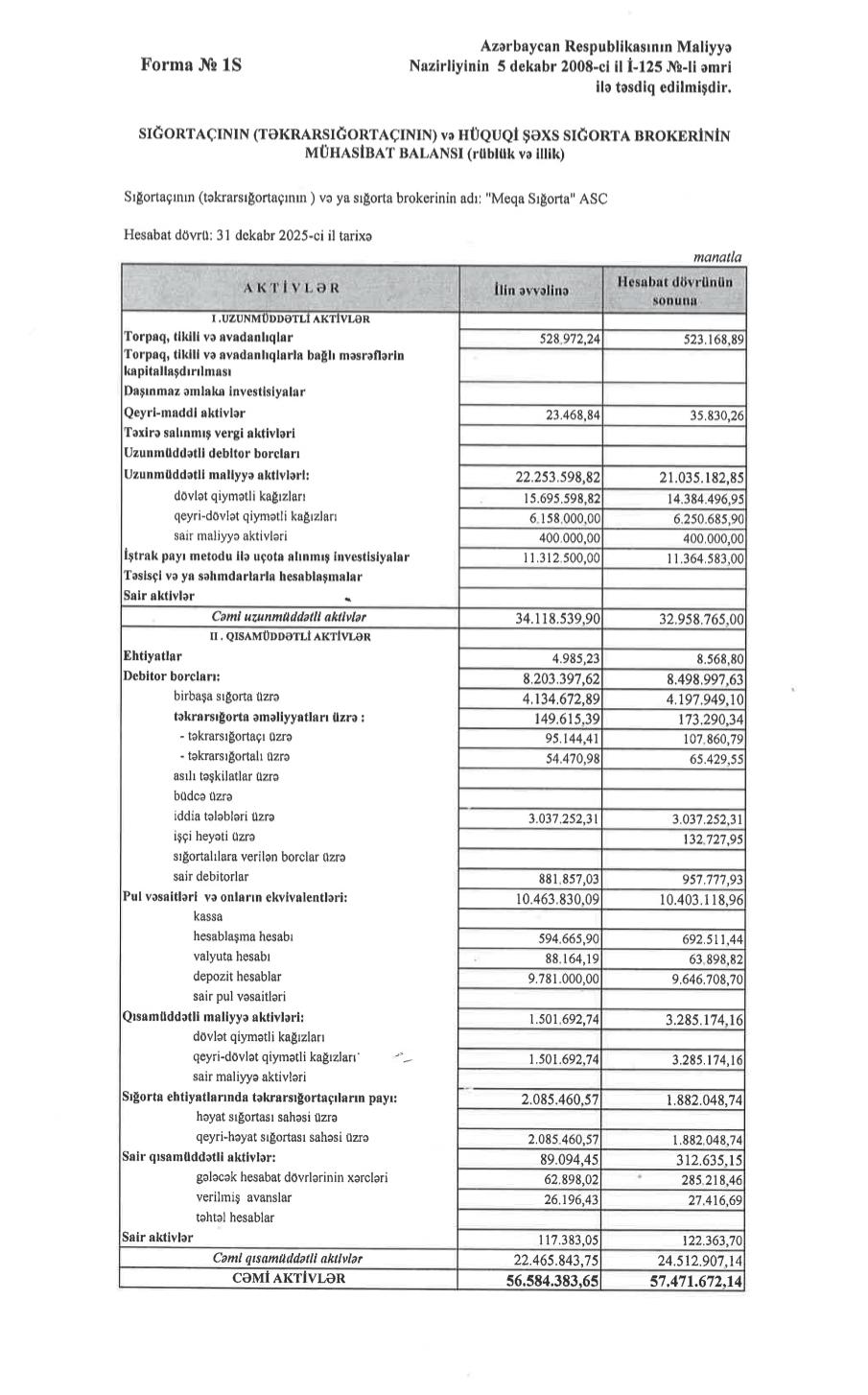 Hesabat dövründə "Meqa Sığorta" ASC-nin cəmi aktivləri 56 milyon 584 min manat, cəmi öhdəlikləri isə 27 milyon 365 min manat olub.
