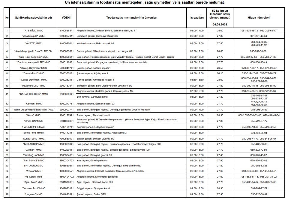 Məlumata görə, unun ən aşağı topdansatış qiyməti 26,1 manat olmaqla Şabran rayonunda, ən yüksək topdansatış qiyməti 28,6 manat olmaqla Gəncə şəhərində qeydə alınıb.
