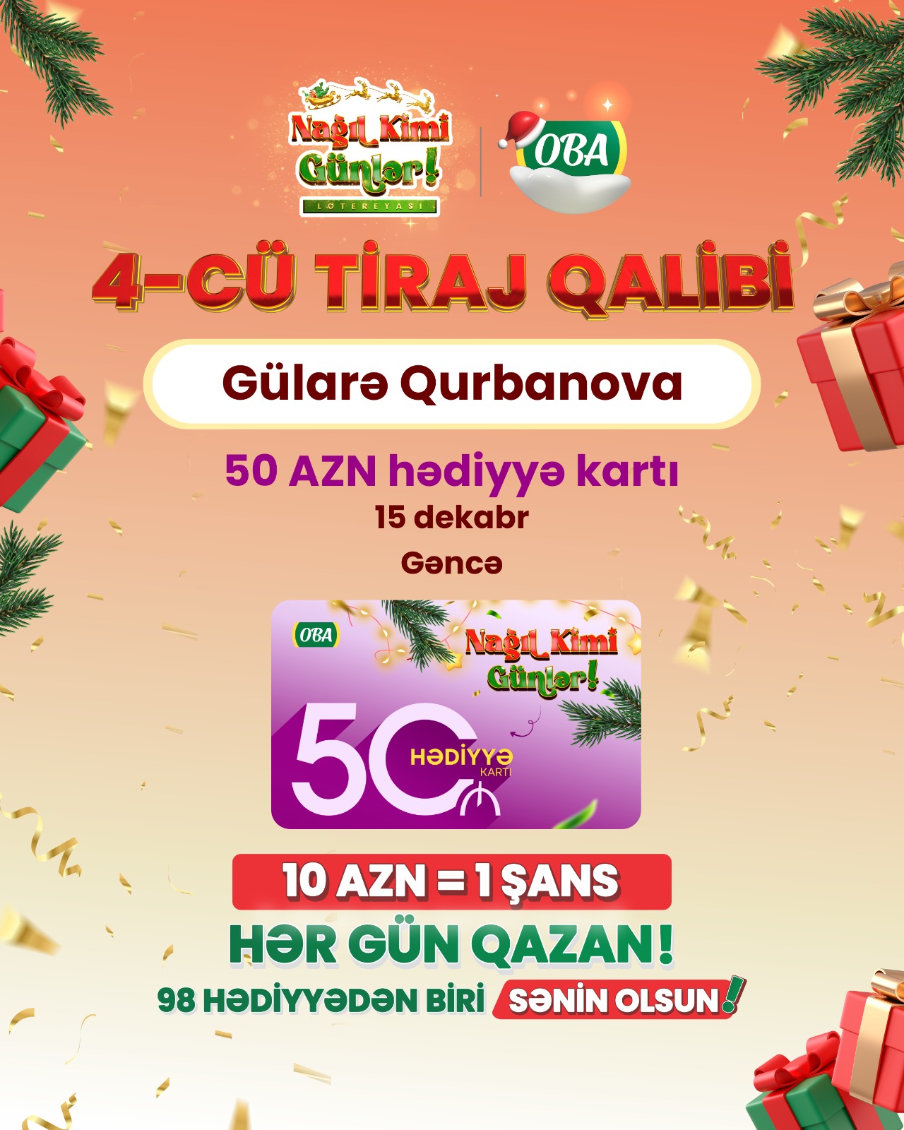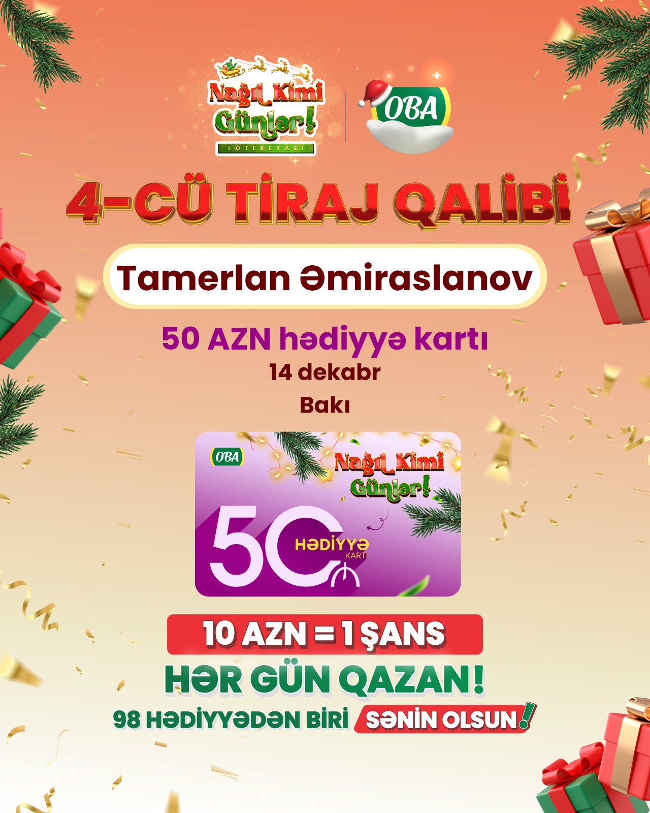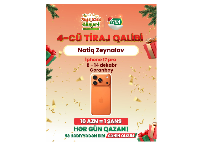 Lotereya müddətində 31 şanslı müştəri 100 AZN-lik OBA bonus kartı, 62 şanslı müştəri 50 AZN-lik OBA bonus kartı, 4 şanslı müştəri iPhone 17 Pro, 1 şanslı müştəri isə Changan Qiyuan Q05 avtomobili qazanacaq.