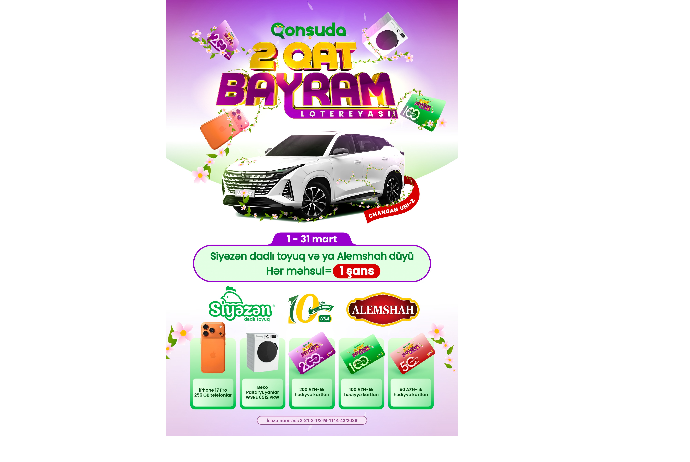 “Qonşuda 2 qat bayram” lotereyası çərçivəsində iştirakçılar üçün bir-birindən dəyərli hədiyyələr təqdim olunur. Uduşlar sırasında iPhone 17 Pro mobil telefonları, paltaryuyan maşınlar və alış-veriş kartları yer alır. Kampaniyanın final tirajında isə iştirakçılardan biri möhtəşəm əsas mükafat – Changan UNI-Z avtomobilinin sahibi olacaq.