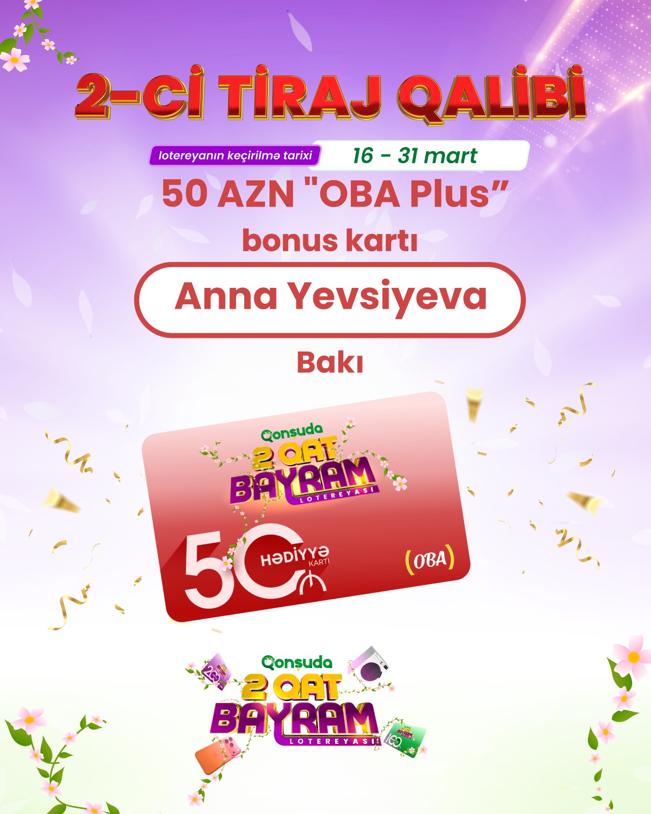 Anna Yevsiyeva (Kürdəmir) – 50 OBA Plus bonusu sahib olub.