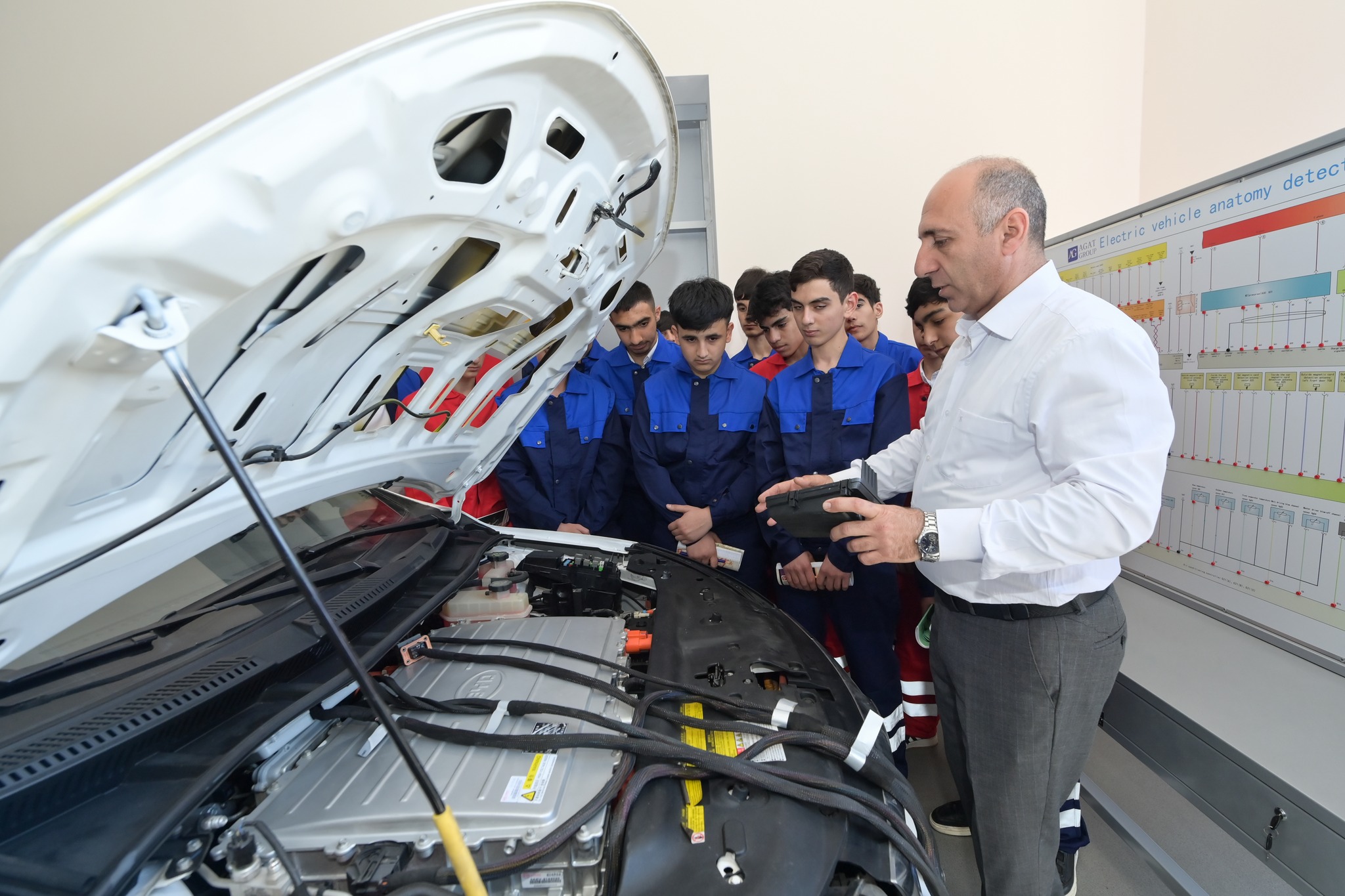 Avtosevis emalatxanası xüsusilə maraqlı idi – buradakı avadanlıqlara Bakıdakı avtoservislərin əksəriyyəti qibtə edə bilər. Tələbələr avtoservisdə nəinki adi, eləcə də son illər çox yayılan elektrik və hibrid avtomobillərini təmiri və diaqnostikasını öyrənirlər. Bu Azərbaycanda yeni peşələrdən biridir, hazırda bu ixtisasda 20 tələbə qəbul olunub. Dərslərin həm praktiki, həm də nəzəri aparıldığı servis bütün avadanqlıqlarla təmin olunub. Burada yük və minik avtomobilləri üçün xüsusi simulyatorlar fəaliyyət göstərir, bu tələbələrə özlərini təkmilləşdirməyə imkan verir, həm də avtomobil sürmək öyrədilir.