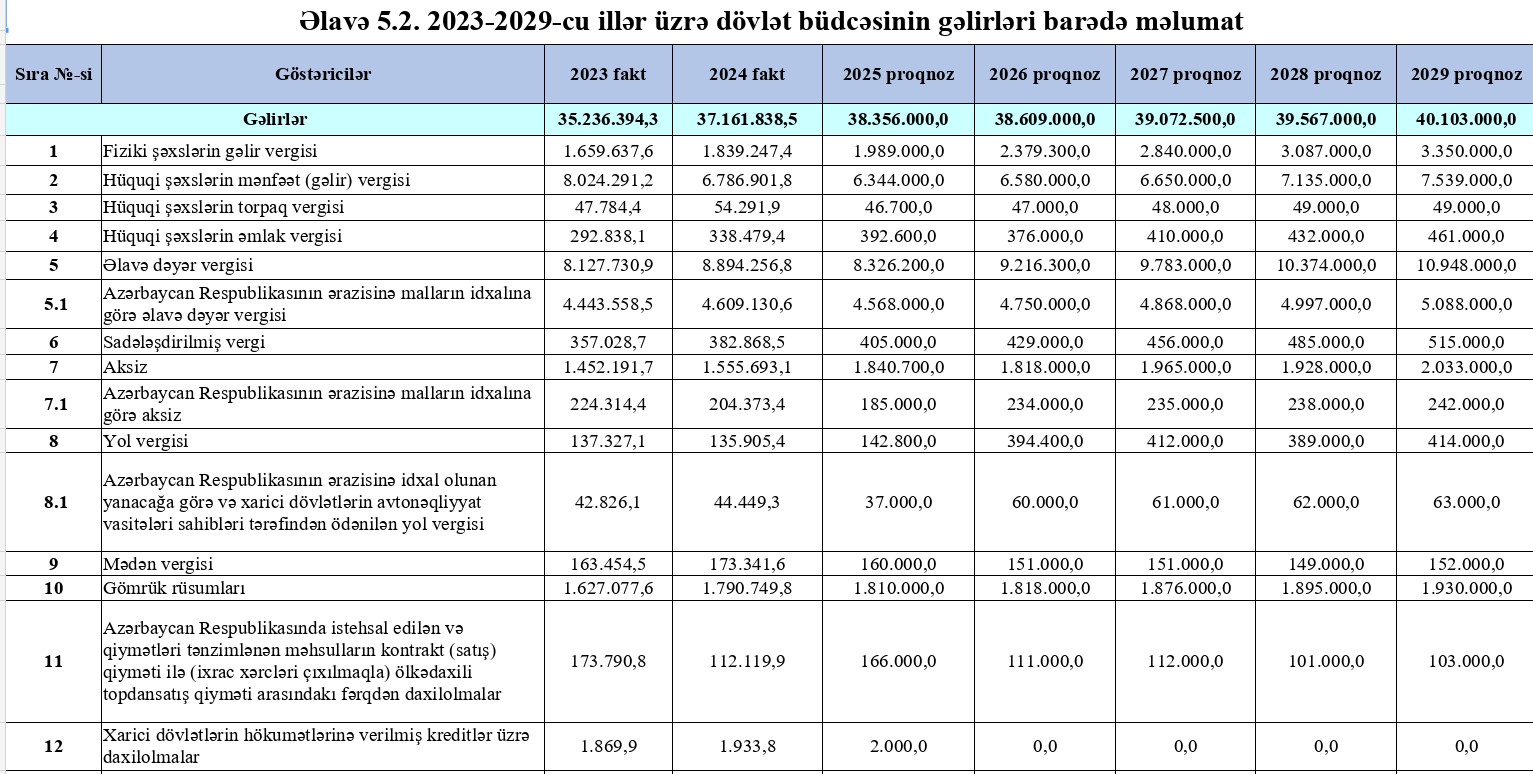 Azərbaycanın dövlət büdcəsinin gəlirləri 2023–2029-cu illər aralığında sabit artım göstərəcək.