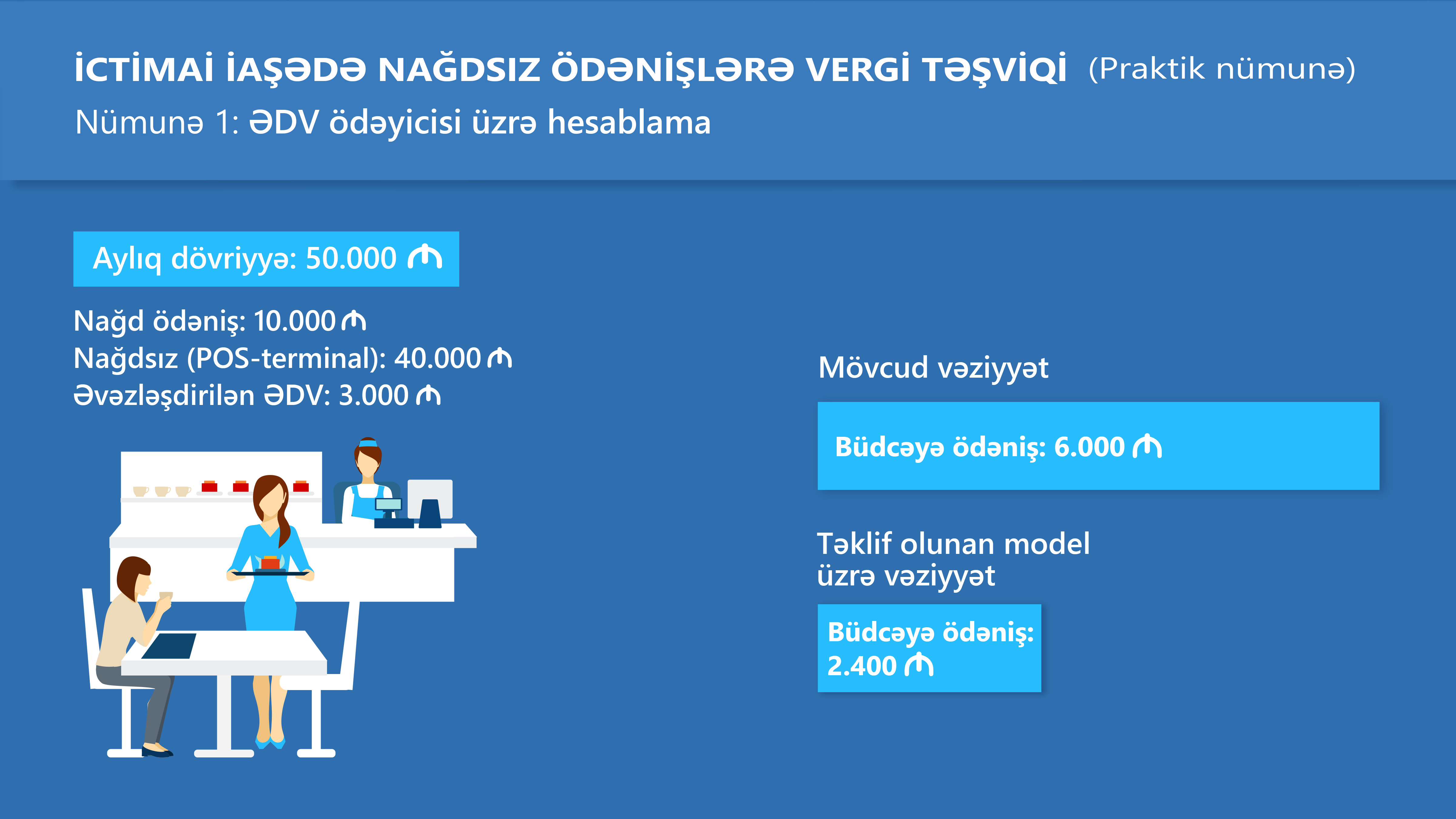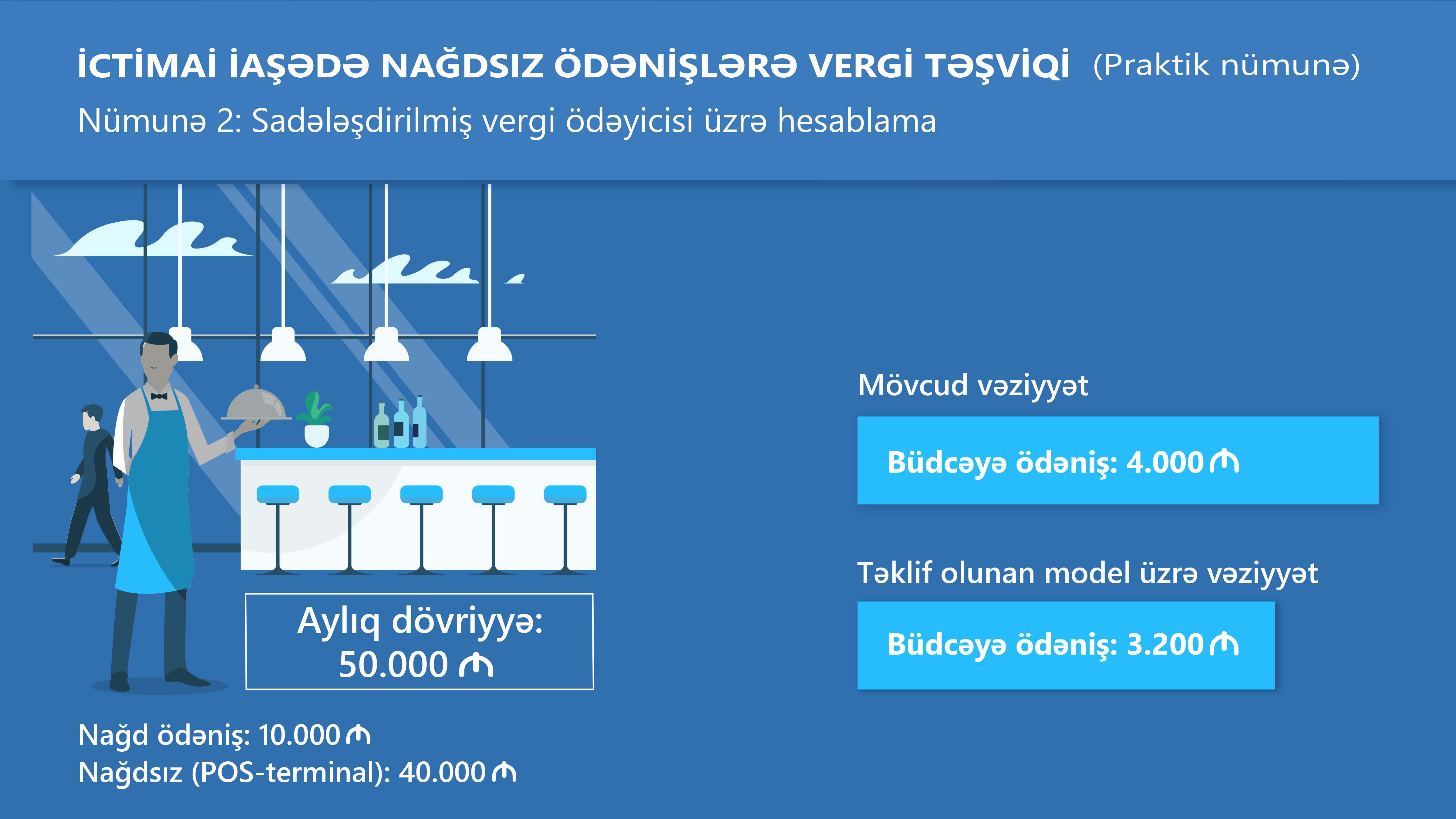 İctimai iaşə fəaliyyəti ilə məşğul olan sadələşdirilmiş vergi ödəyicisinin ay ərzində göstərdiyi xidmətlərin dəyəri 50 min manat məbləğində olub və bu məbləğin 10 min manatı nağd şəkildə, 40 min manatı isə POS-terminal vasitəsilə nağdsız qaydada ödənilib. Bu halda büdcəyə ödənilməli sadələşdirilmiş verginin məbləği 4 min manat hesablanacaqdısa, dəyişiklikdən sonra həmin məbləğ 3.200 manat təşkil edəcək.