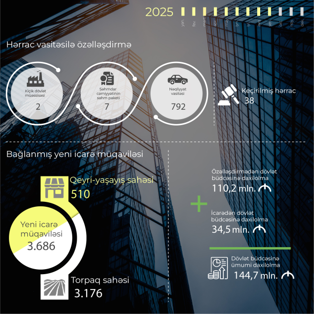 Əmlak Məsələləri Dövlət Xidmətindən FED.az-a bildirilib ki, hərraclarda 7 səhmdar cəmiyyətinin səhm paketi, 2 kiçik dövlət müəssisəsi, 792 nəqliyyat vasitəsi özəlləşdirilib.